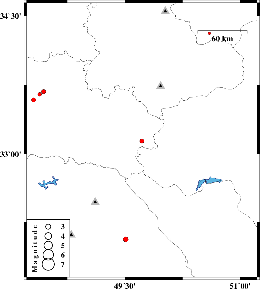 | 2012/11/09 | 23:55:52.5 | 03:25:52.5 | 33.65 | 48.39 | 18 | ML:2.2 | Lorestan Province, 19 km North of Khorramabad |