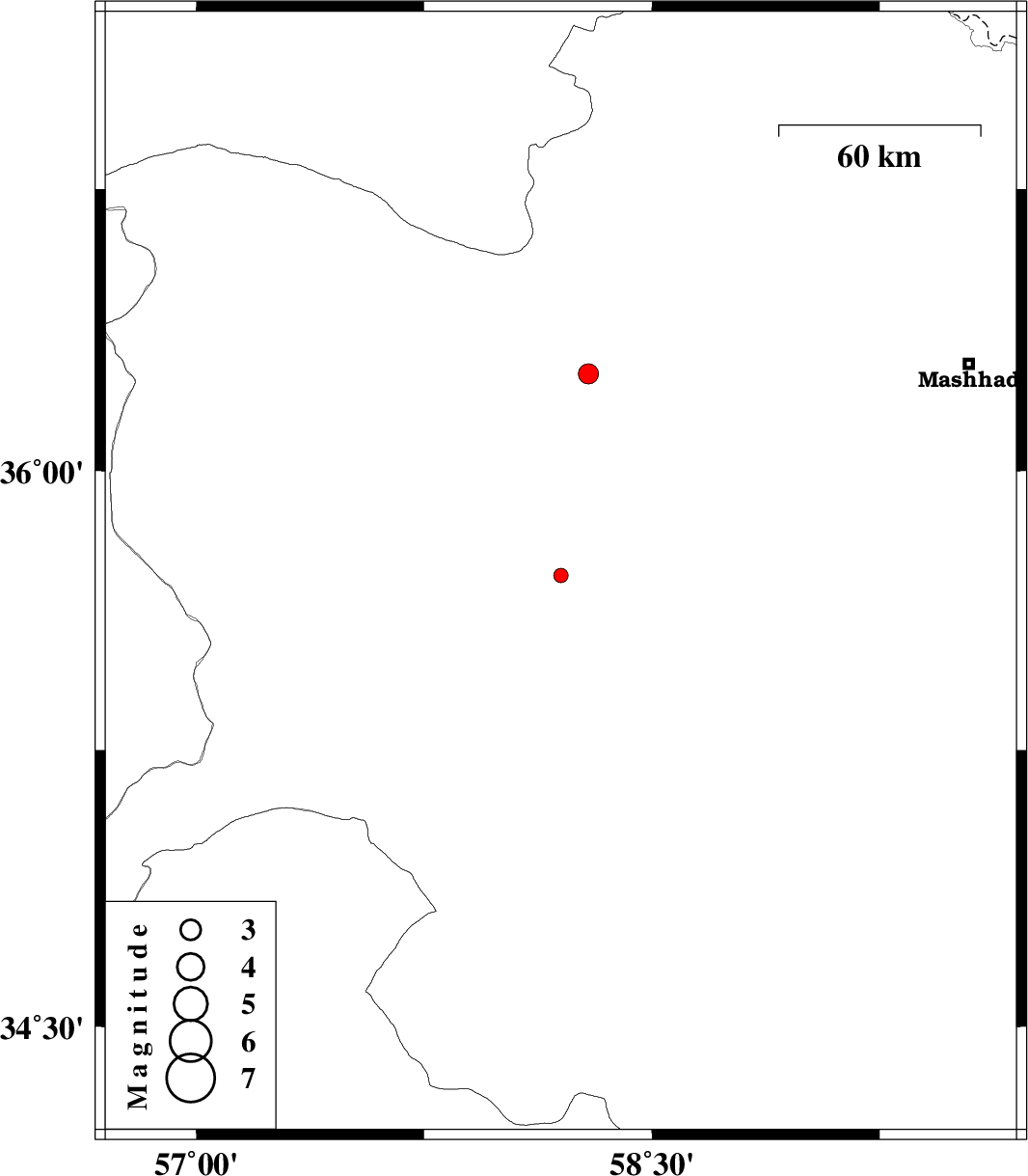 | 2012/11/08 | 05:50:27.8 | 09:20:27.8 | 36.26 | 58.29 | 14 | ML:3 | Khorasan(center) Province, 47 km West of Neyshabur |