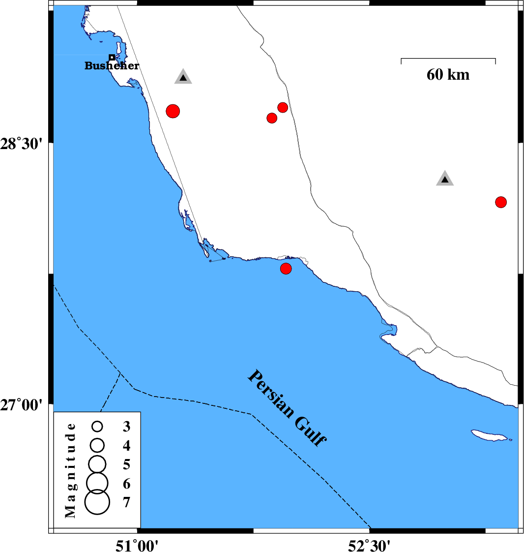 | 2012/11/16 | 04:57:48.3 | 08:27:48.3 | 27.78 | 51.96 | 15 | ML:3.2 | Persian Gulf, 12 km West of Bandar-e kangan | ||
