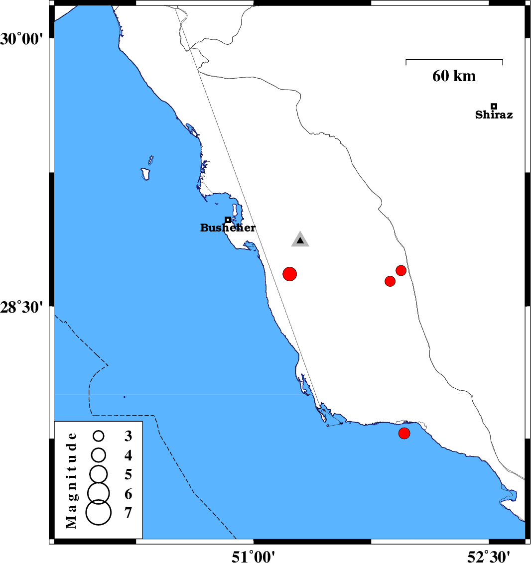 | 2012/11/16 | 04:57:48.3 | 08:27:48.3 | 27.78 | 51.96 | 15 | ML:3.2 | Persian Gulf, 12 km West of Bandar-e kangan | ||
