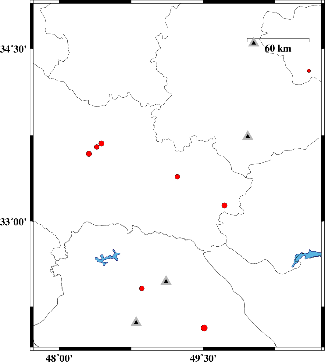 | 2012/11/10 | 16:17:30.0 | 19:47:30.0 | 33.59 | 48.31 | 18 | ML:2.5 | Lorestan Province, 12 km North of Khorramabad | ||
