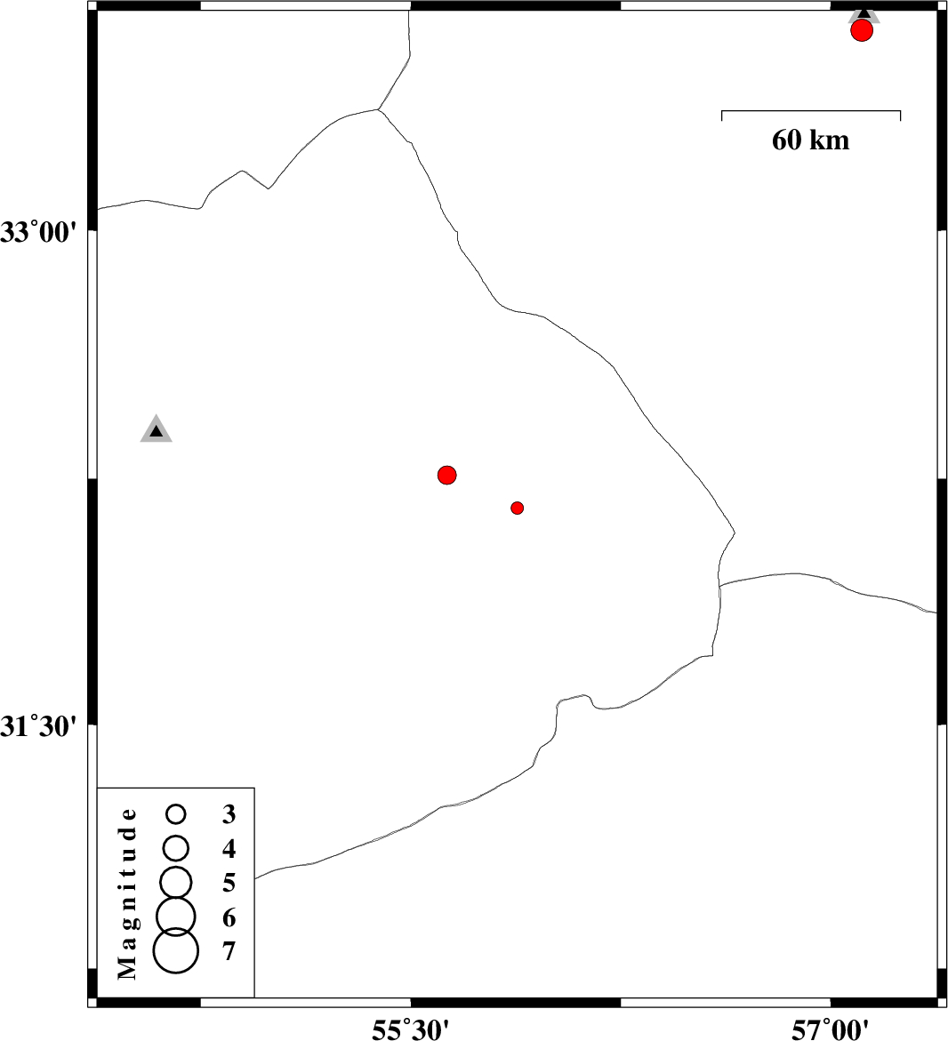 | 2012/11/12 | 11:05:47.5 | 14:35:47.5 | 32.26 | 55.63 | 14 | ML:2.9 | Yazd Province, 76 km North-East of Bafq | ||