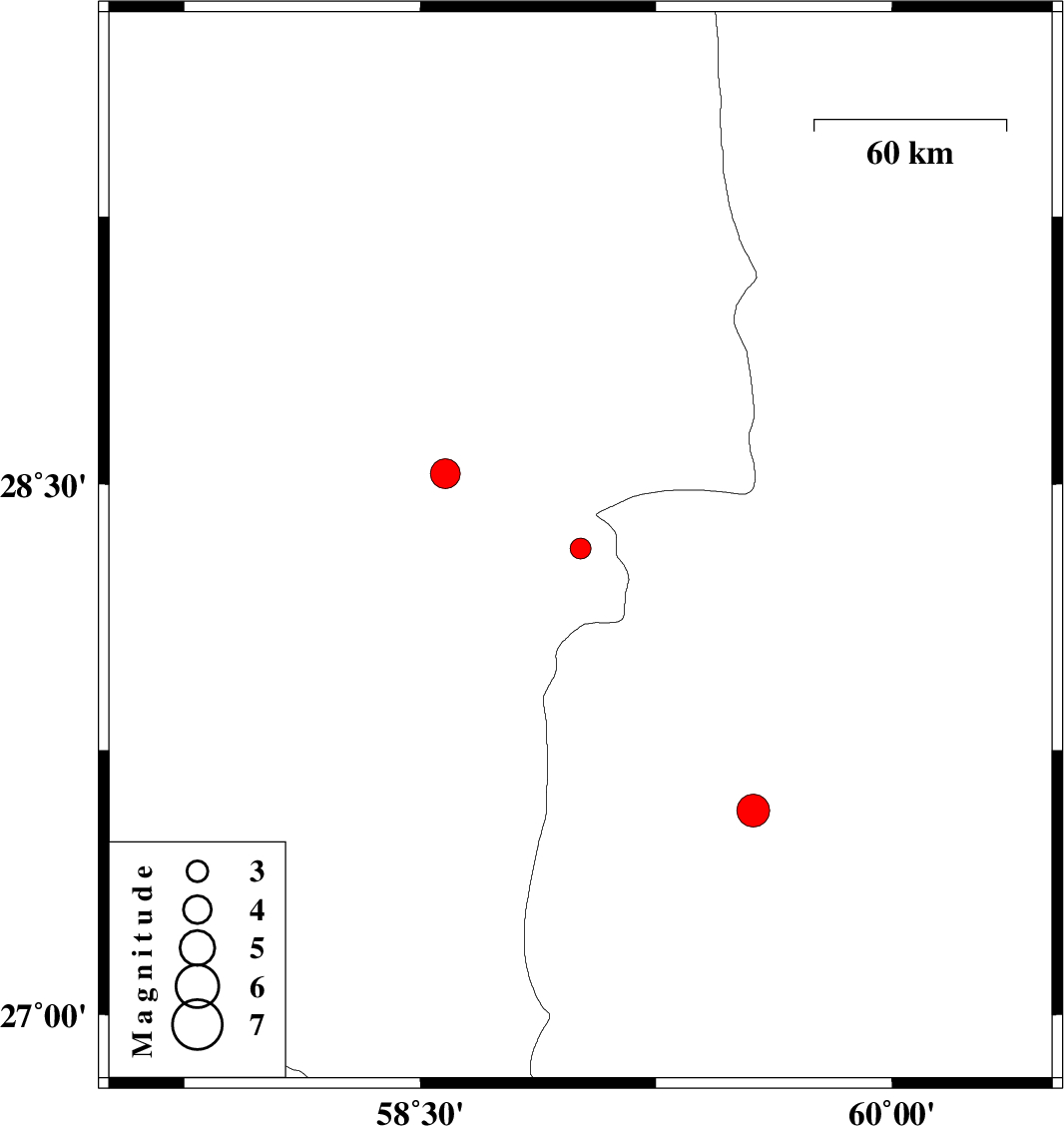 | 2012/10/21 | 16:38:24.1 | 20:08:24.1 | 27.58 | 59.56 | 15 | ML:4.7 | Sistan va Baloochestan Province, 119 km North-West of Iranshahr |