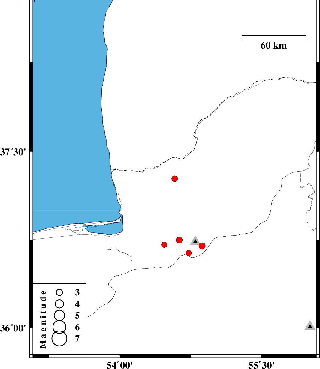 | 2012/11/12 | 08:34:01.5 | 12:04:01.5 | 36.64 | 54.73 | 14 | ML:2.7 | Golestan Province, 32 km South-West of Ali Abad |