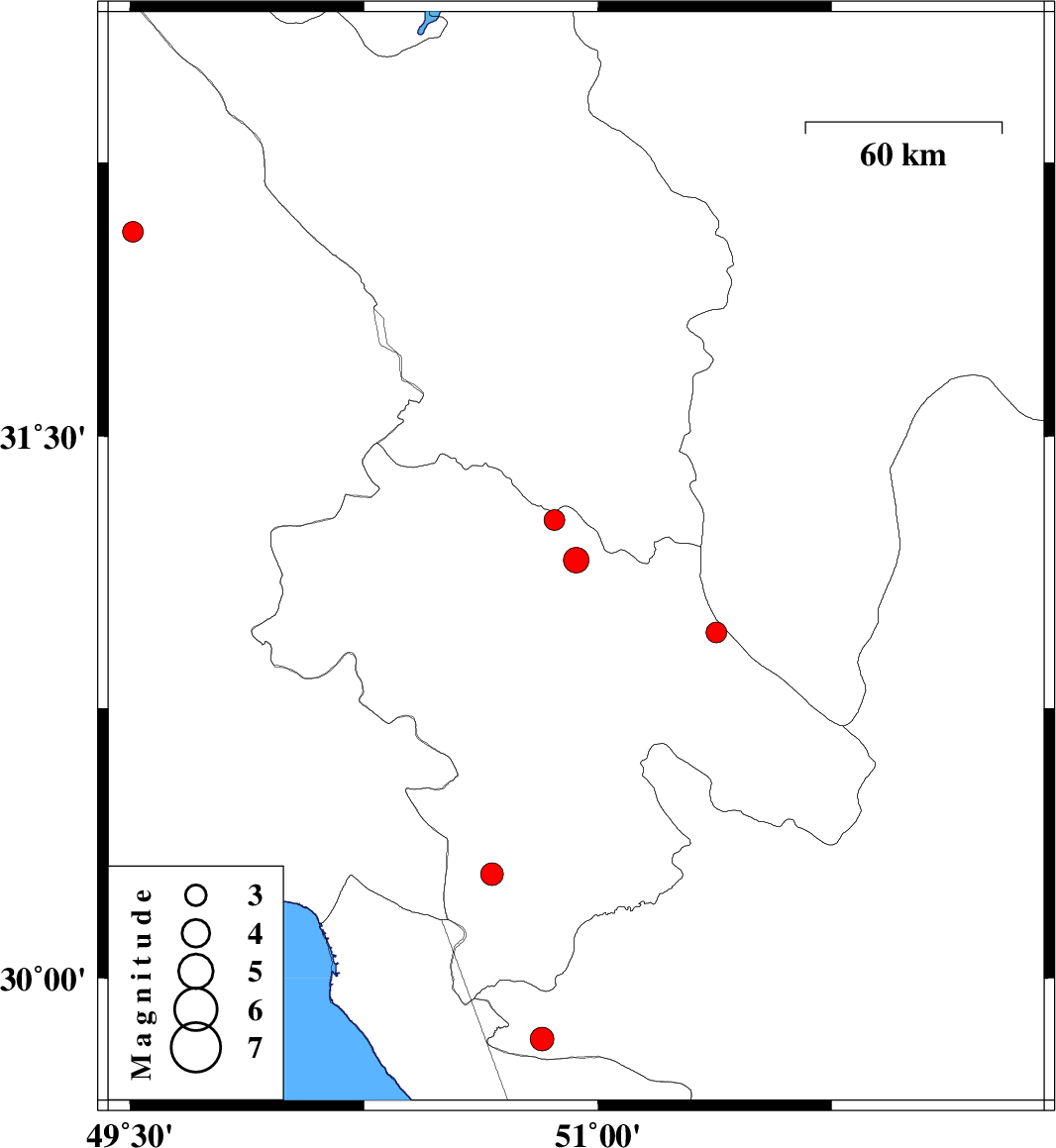 | 2012/11/19 | 22:29:14.1 | 01:59:14.1 | 31.27 | 50.86 | 14 | ML:3 | Kohkiluieh va boyerahmad Province, 26 km South of Lordegan | ||