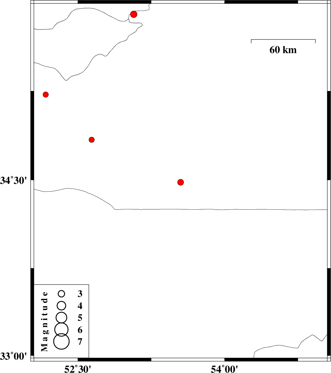 | 2012/11/11 | 16:00:44.8 | 19:30:44.8 | 34.84 | 52.64 | 17 | ML:2.6 | Semnan Province, 50 km South-East of Garmsar | ||