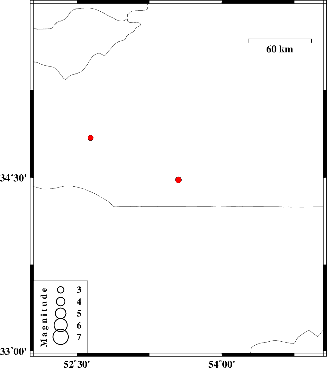 | 2012/11/18 | 16:08:20.9 | 19:38:20.9 | 34.48 | 53.55 | 18 | ML:2.8 | Semnan Province, 121 km South-East of Semnan | ||