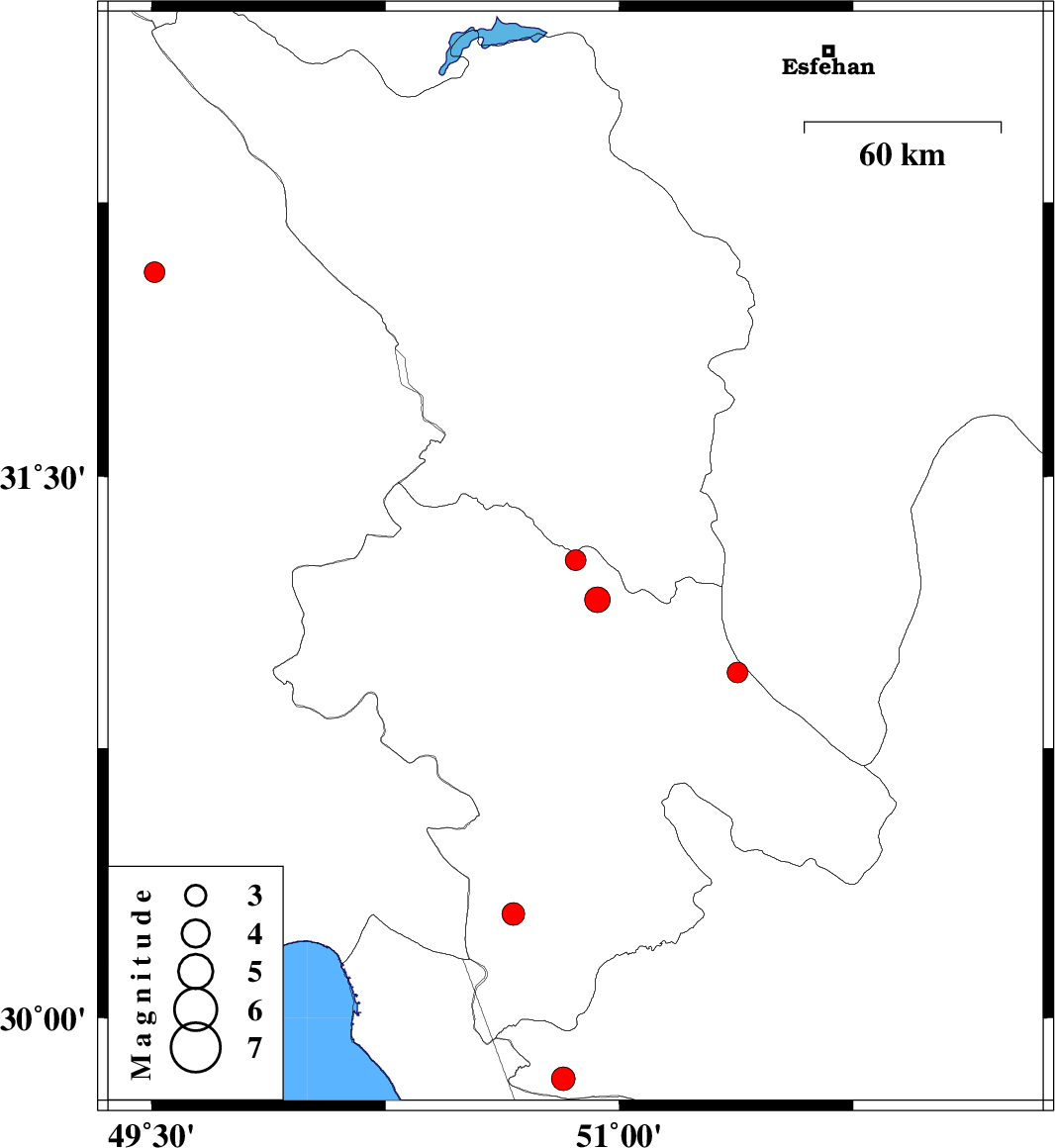 | 2012/10/27 | 02:22:46.9 | 05:52:46.9 | 30.96 | 51.38 | 14 | ML:2.9 | Kohkiluieh va boyerahmad Province, 12 km Sisakht |