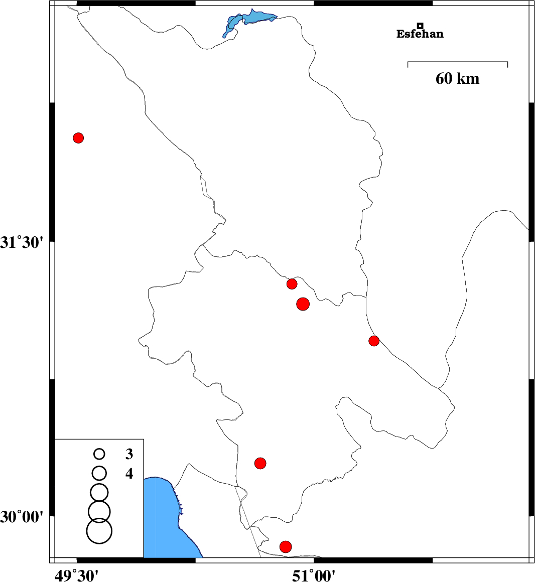 | 2012/11/19 | 02:51:25.8 | 06:21:25.8 | 31.16 | 50.93 | 16 | ML:3.6 | Kohkiluieh va boyerahmad Province, 40 km South-East of Lordegan | ||