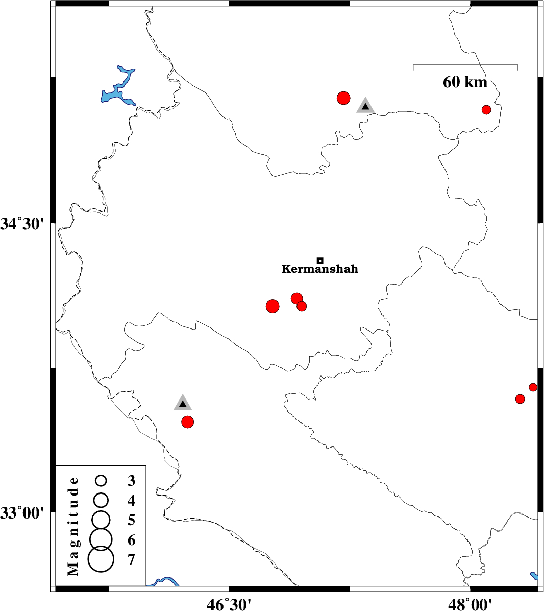 | 2012/11/19 | 14:11:24.8 | 17:41:24.8 | 34.07 | 46.77 | 37 | ML:3.7 | Kermanshah Province, 16 km East of Eslam Abad-E-Gharb | ||