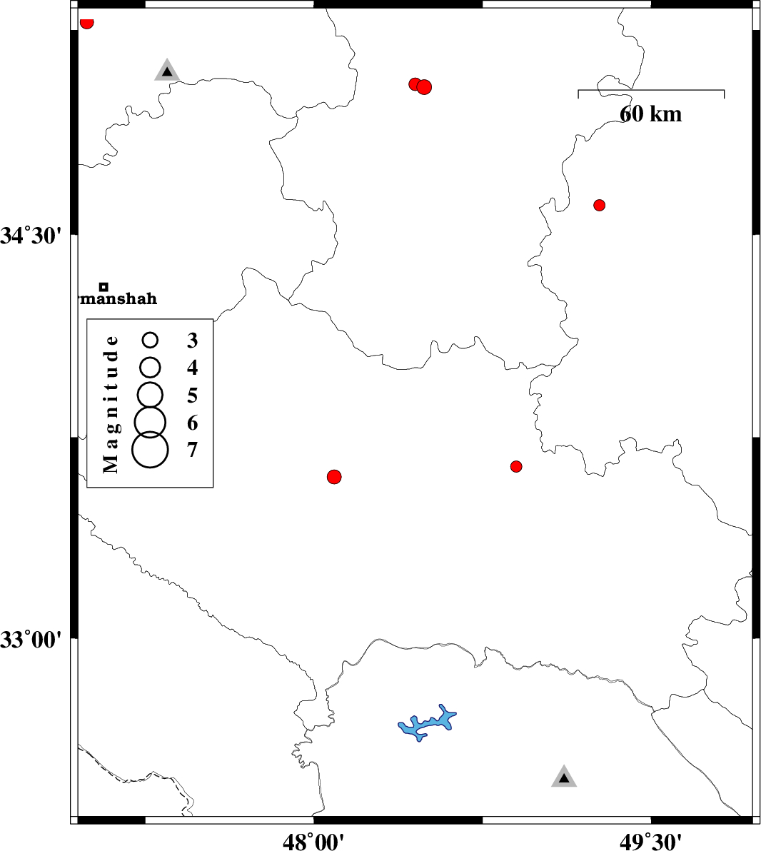 2012/11/20 | 15:19:38.3 | 18:49:38.3 | 34.07 | 46.95 | 14 | ML:2.7 | Kermanshah Province, 29 km South-West of Kermanshah | ||