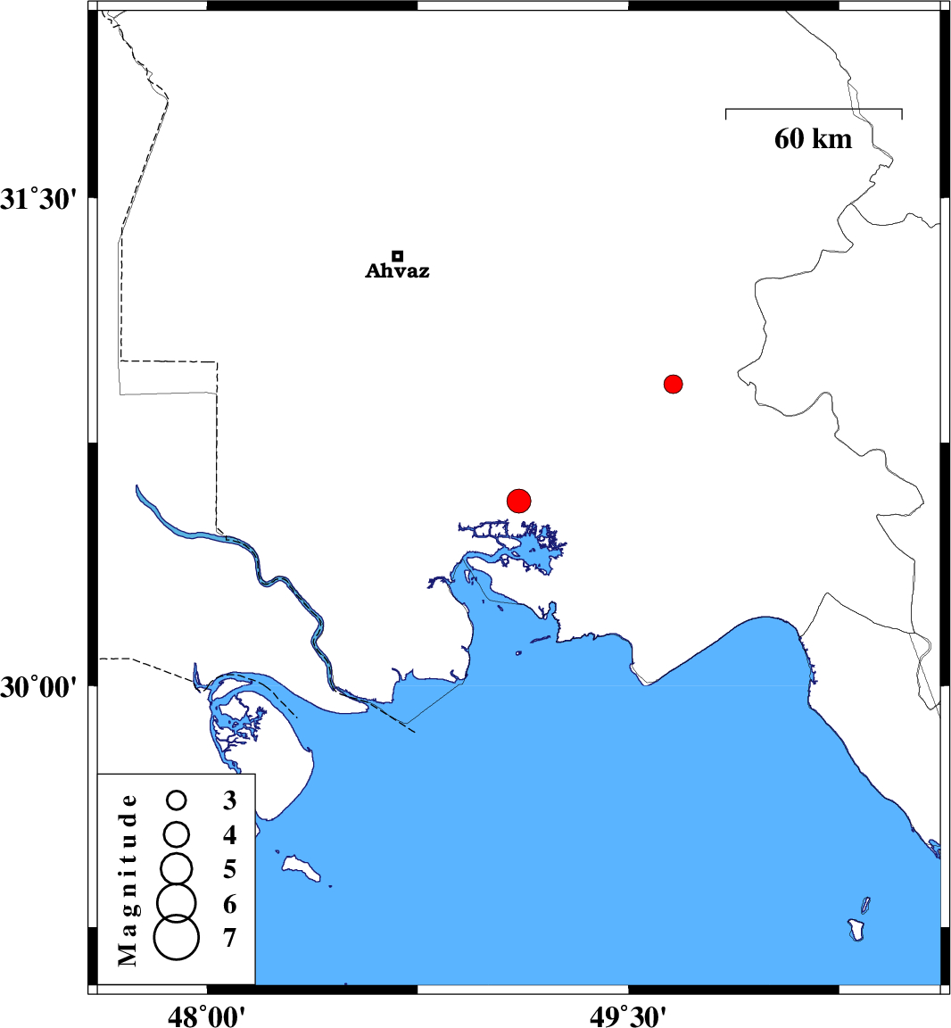 | 2012/11/22 | 16:26:48.4 | 19:56:48.4 | 30.93 | 49.66 | 18 | ML:3 | Khoozestan Province, 19 km North of Omidiyeh |