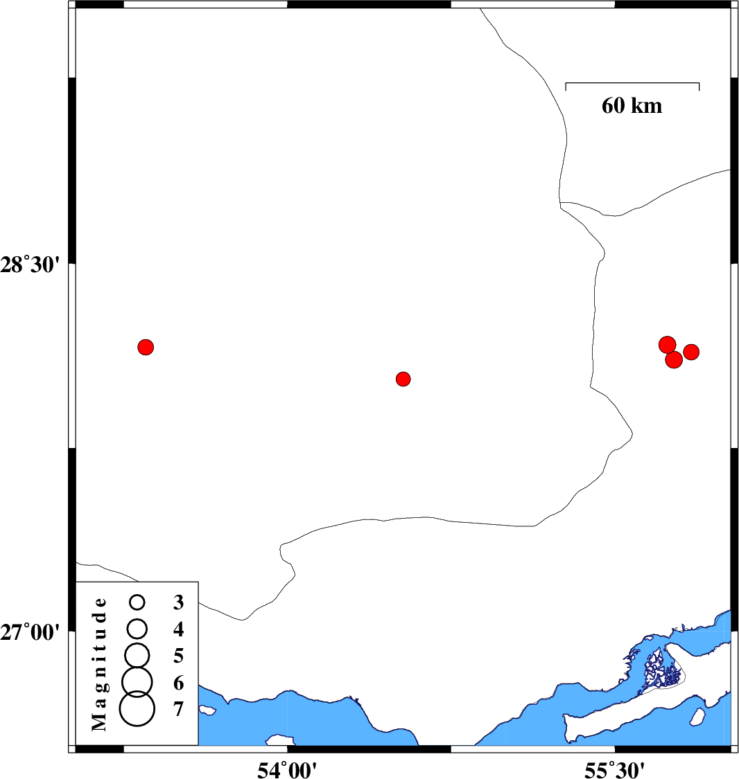 | 2012/11/24 | 17:00:04.0 | 20:30:04.0 | 28.03 | 54.53 | 15 | ML:2.9 | Fars Province, 44 km North-East of Lar | ||