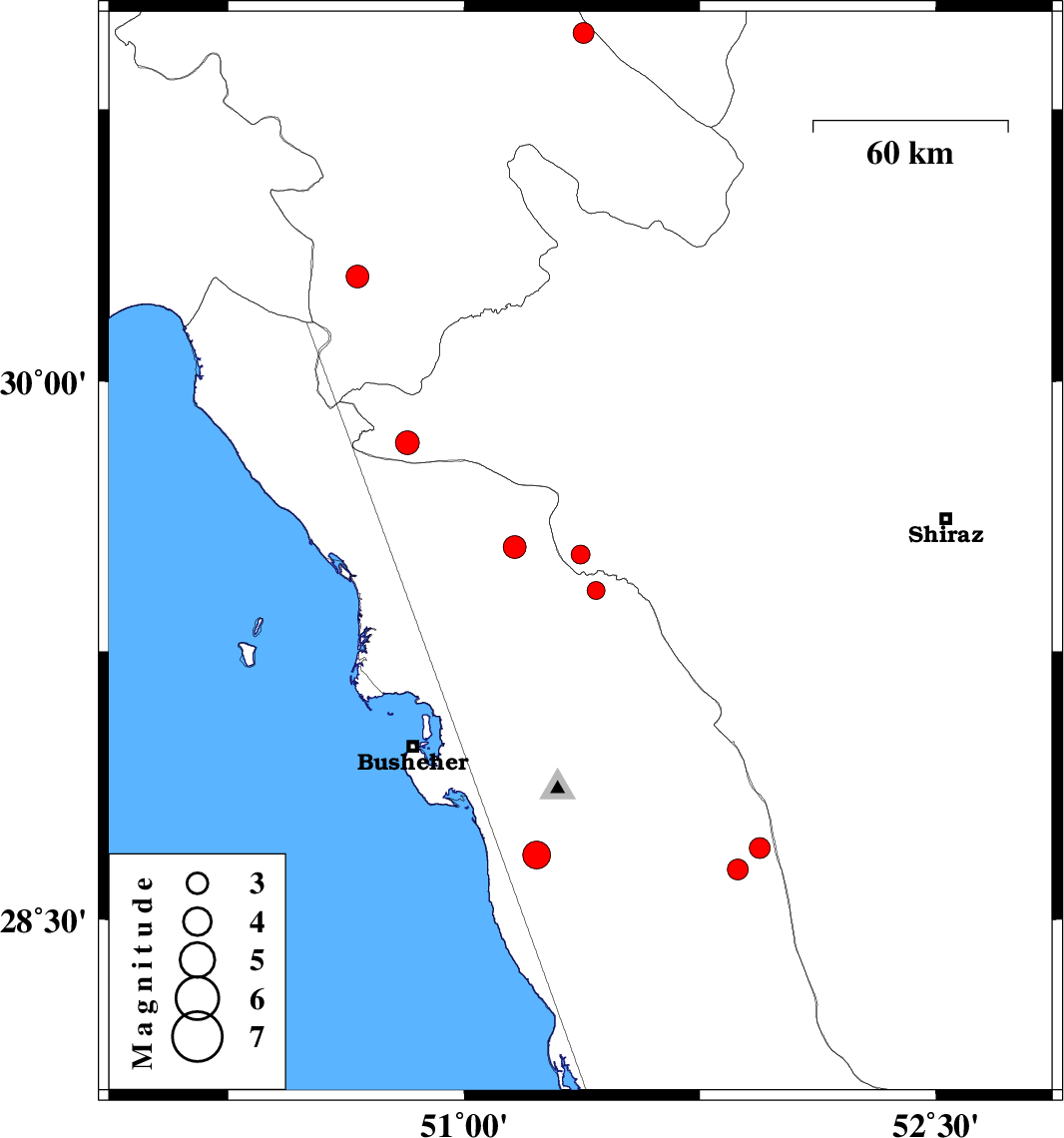 | 2012/11/24 | 16:45:15.5 | 20:15:15.5 | 29.42 | 51.42 | 15 | ML:2.5 | Bushehr Province, 27 km North-East of Borazjan | ||