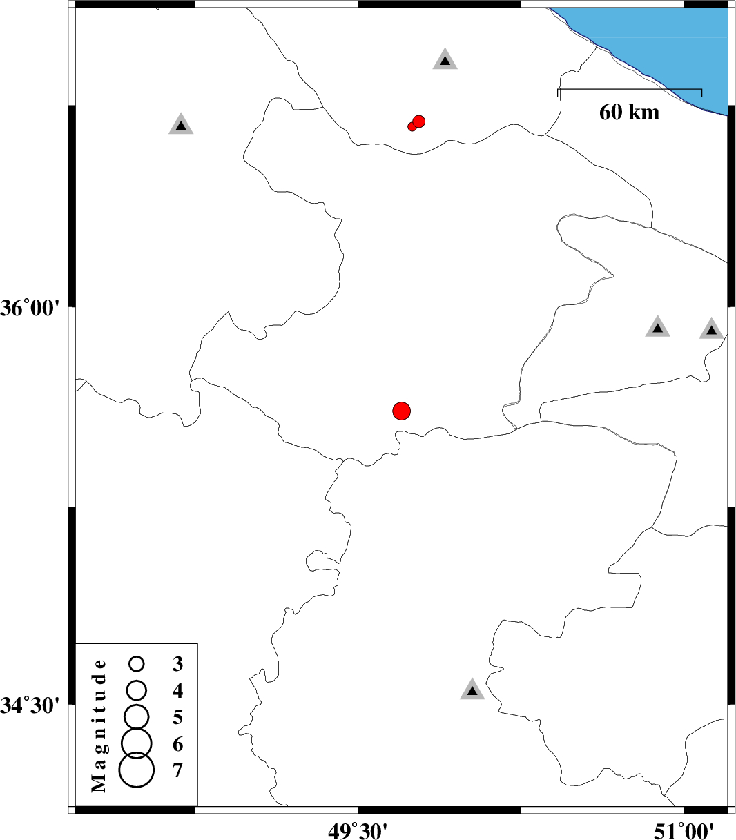 | 2012/11/18 | 02:16:45.8 | 05:46:45.8 | 36.67 | 49.75 | 30 | ML:1.9 | Gilan Province, 33 km South-East of Rudbar |