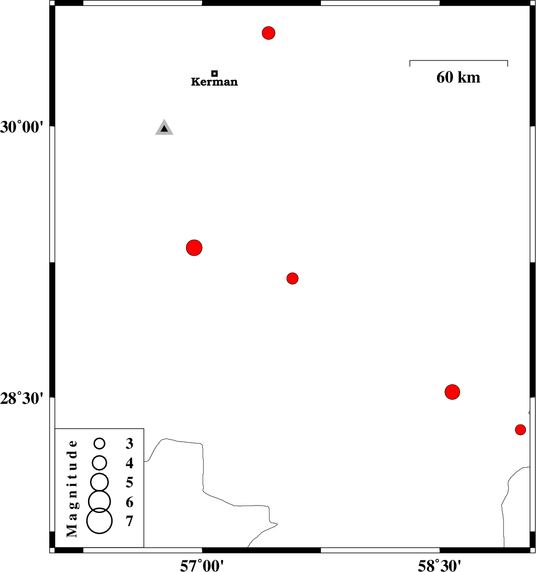| 2012/11/17 | 08:46:01.1 | 12:16:01.1 | 28.32 | 59.01 | 46 | ML:3 | Kerman Province, 109 km South-East of Bam | ||