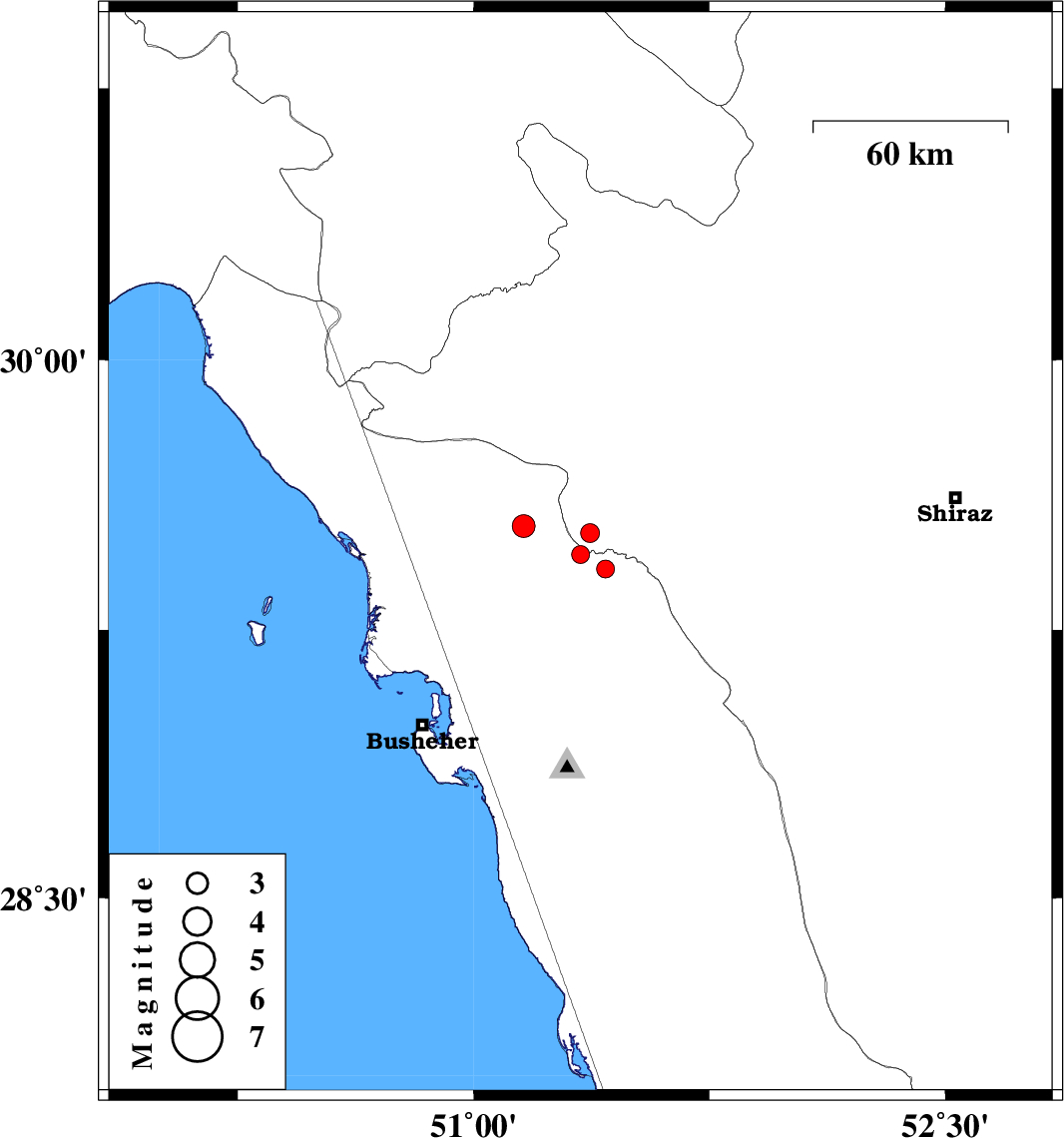 | 2012/11/26 | 14:05:08.2 | 17:35:08.2 | 29.46 | 51.34 | 14 | ML:2.6 | Bushehr Province, 26 km North-East of Borazjan | ||