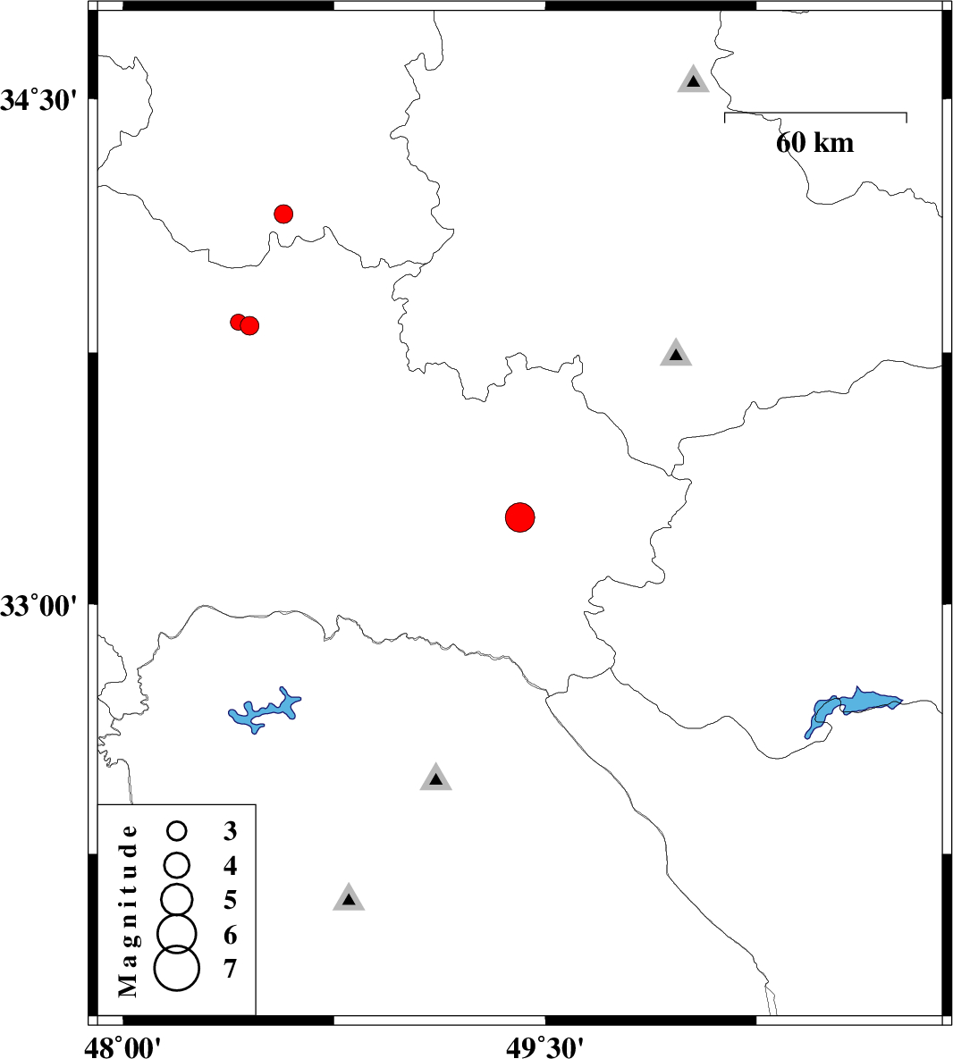 | 2012/11/27 | 06:22:26.0 | 09:52:26.0 | 33.26 | 49.41 | 18 | ML:4.7 | Lorestan Province, 22 km South of Azna | ||