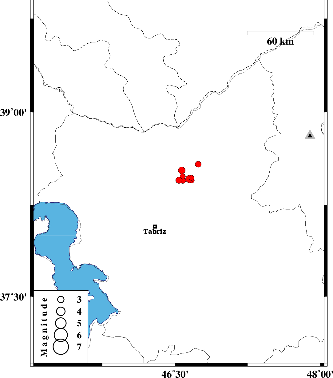 | 2012/11/27 | 09:20:02.1 | 12:50:02.1 | 38.45 | 46.54 | 15 | ML:3 | Azarbaijan Sharghi Province, 47 km West of Ahar | ||