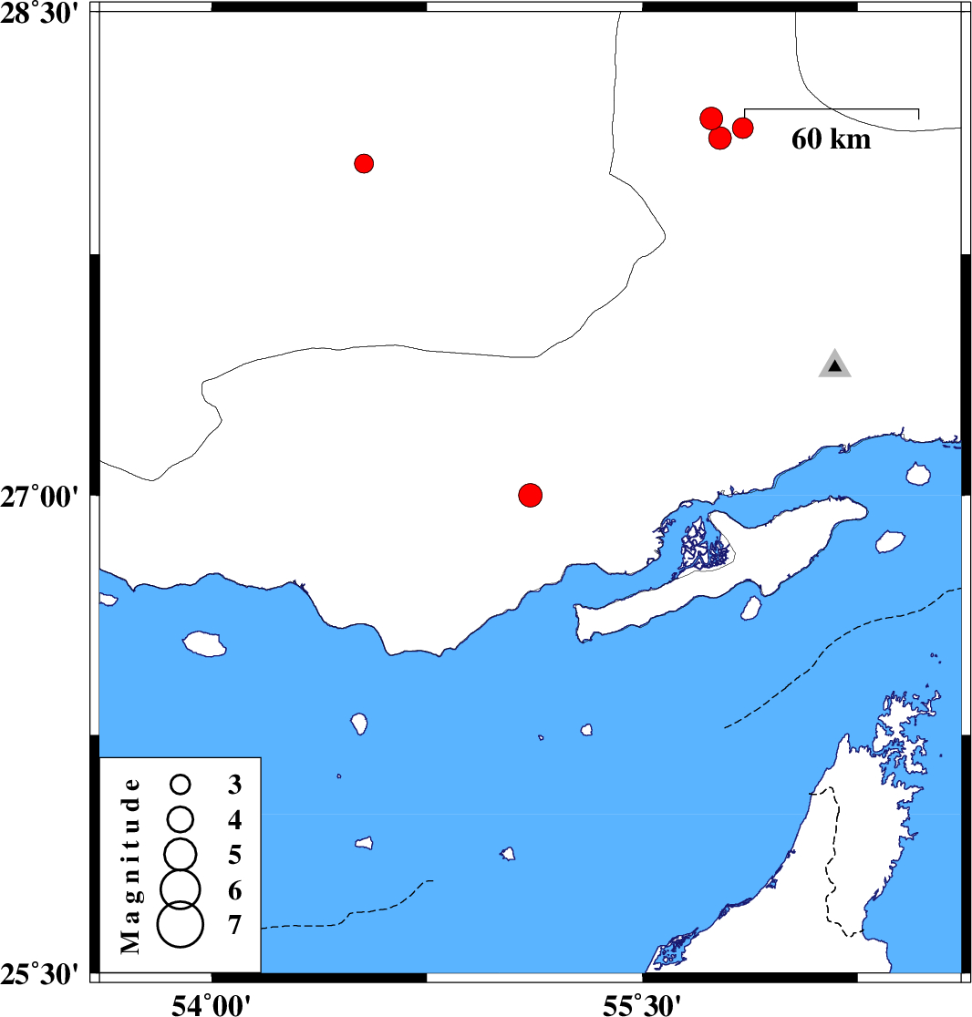 | 2012/11/29 | 05:54:34.4 | 09:24:34.4 | 27 | 55.11 | 14 | ML:3.6 | Hormozgan Province, 58 km North-East of Bandar-e lengeh | ||