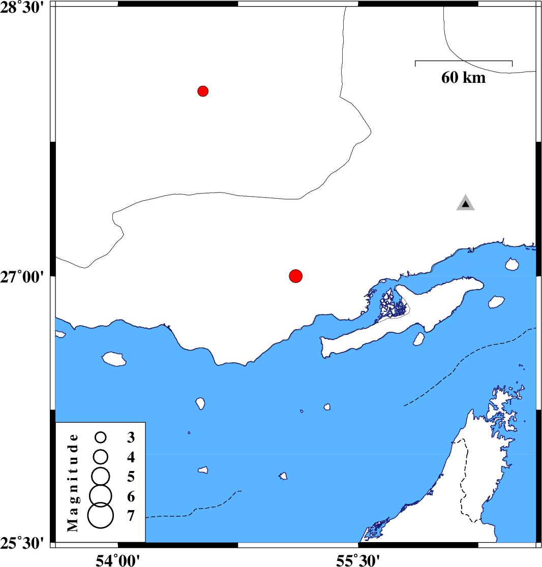 | 2012/11/29 | 05:54:34.4 | 09:24:34.4 | 27 | 55.11 | 14 | ML:3.6 | Hormozgan Province, 58 km North-East of Bandar-e lengeh | ||