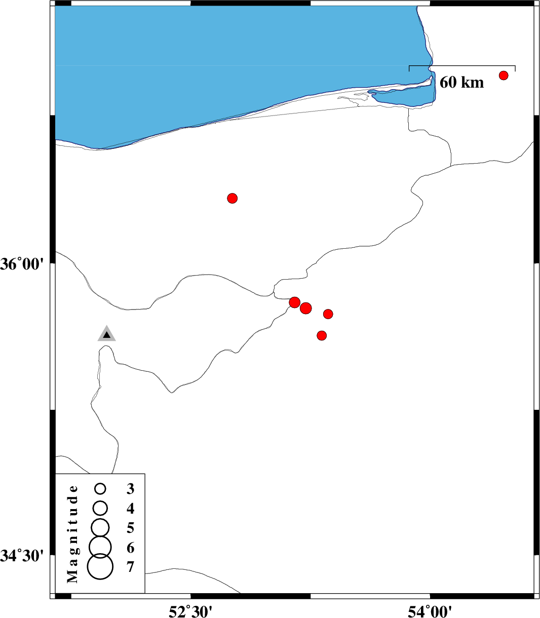 | 2012/11/30 | 04:40:11.3 | 08:10:11.3 | 35.77 | 53.22 | 14 | ML:3.3 | Semnan Province, 28 km North-West of Semnan | ||