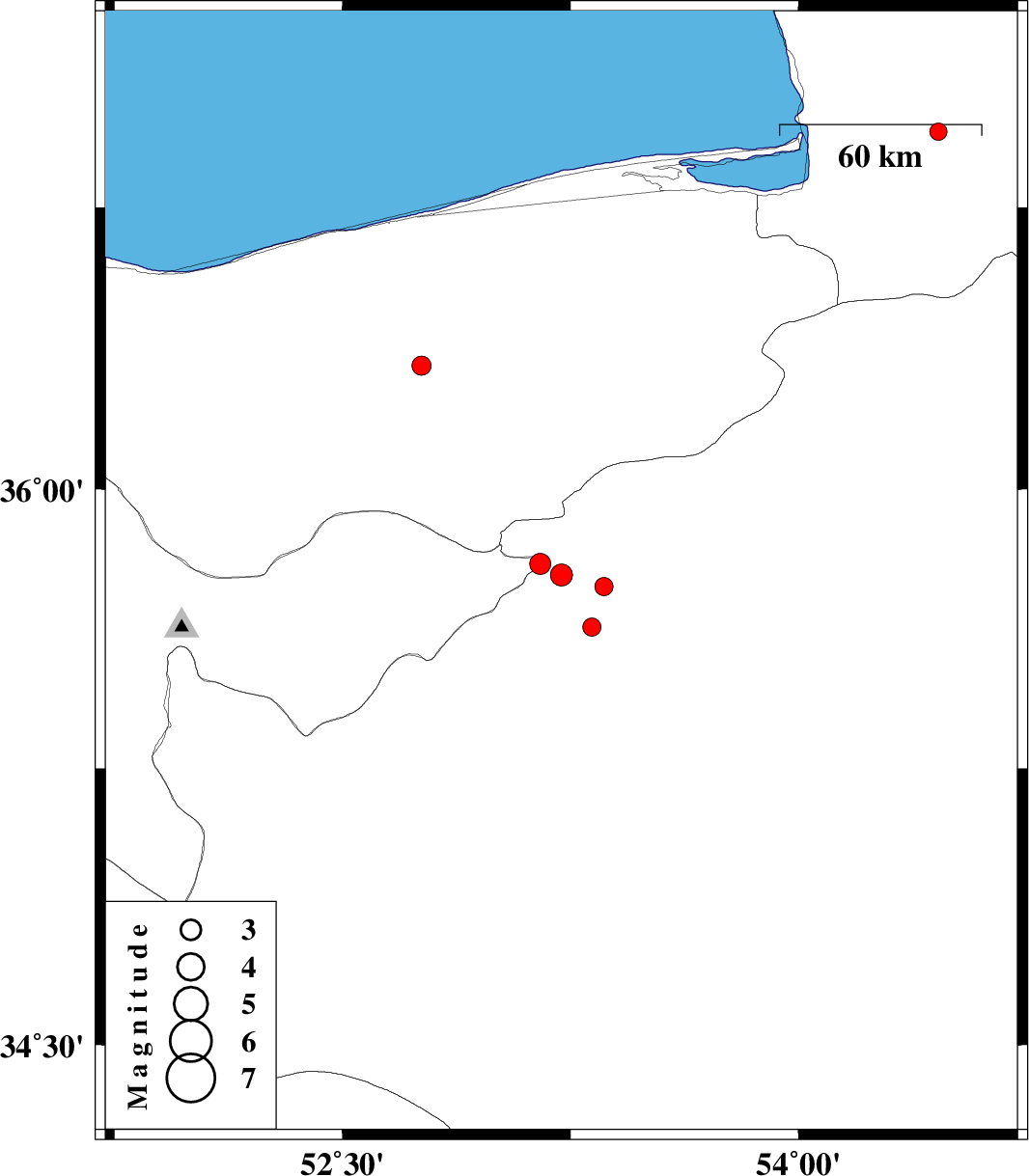 | 2012/11/30 | 04:40:11.3 | 08:10:11.3 | 35.77 | 53.22 | 14 | ML:3.3 | Semnan Province, 28 km North-West of Semnan | ||