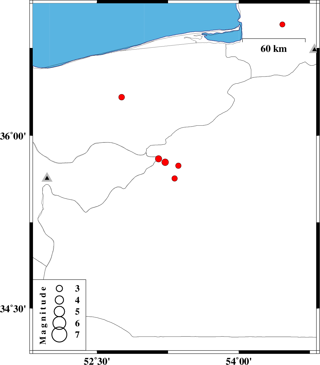 | 2012/11/30 | 04:40:11.3 | 08:10:11.3 | 35.77 | 53.22 | 14 | ML:3.3 | Semnan Province, 28 km North-West of Semnan | ||