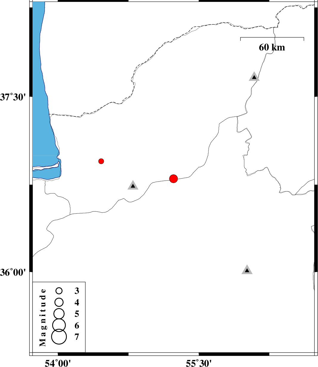 | 2012/11/28 | 19:58:11.6 | 23:28:11.6 | 36.95 | 54.46 | 15 | ML:2.6 | Golestan Province, 7 km Aq Qaleh |