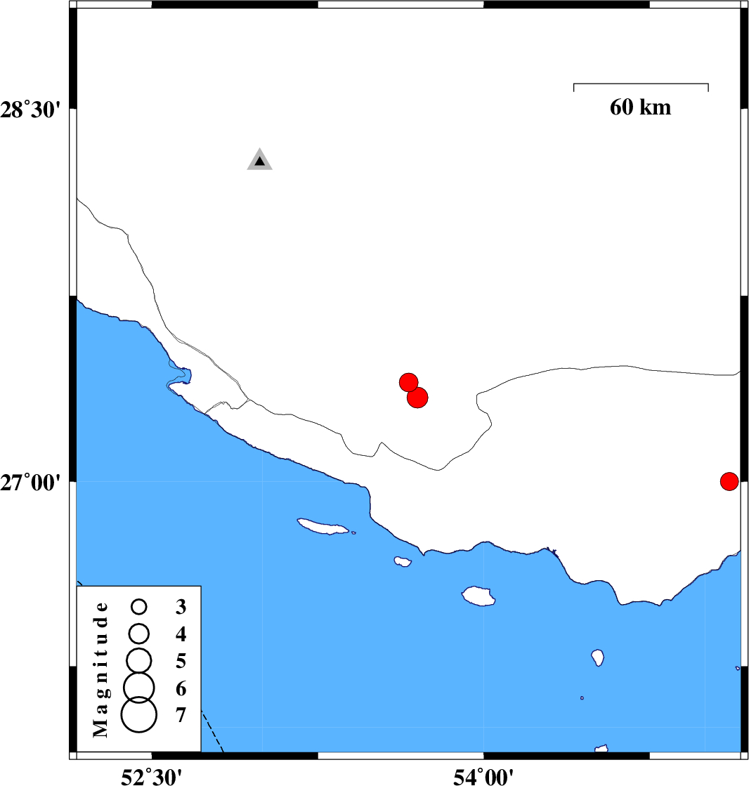 | 2012/11/29 | 05:54:34.4 | 09:24:34.4 | 27 | 55.11 | 14 | ML:3.6 | Hormozgan Province, 58 km North-East of Bandar-e lengeh |