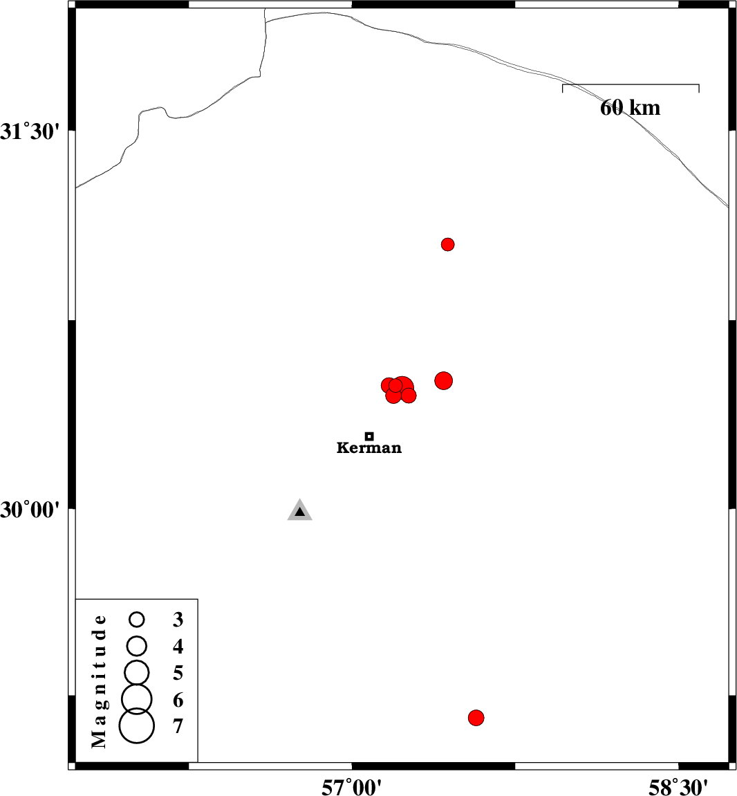 | 2012/12/03 | 13:44:27.8 | 17:14:27.8 | 30.45 | 57.19 | 14 | ML:3.3 | Kerman Province, 21 km North-East of Kerman | ||