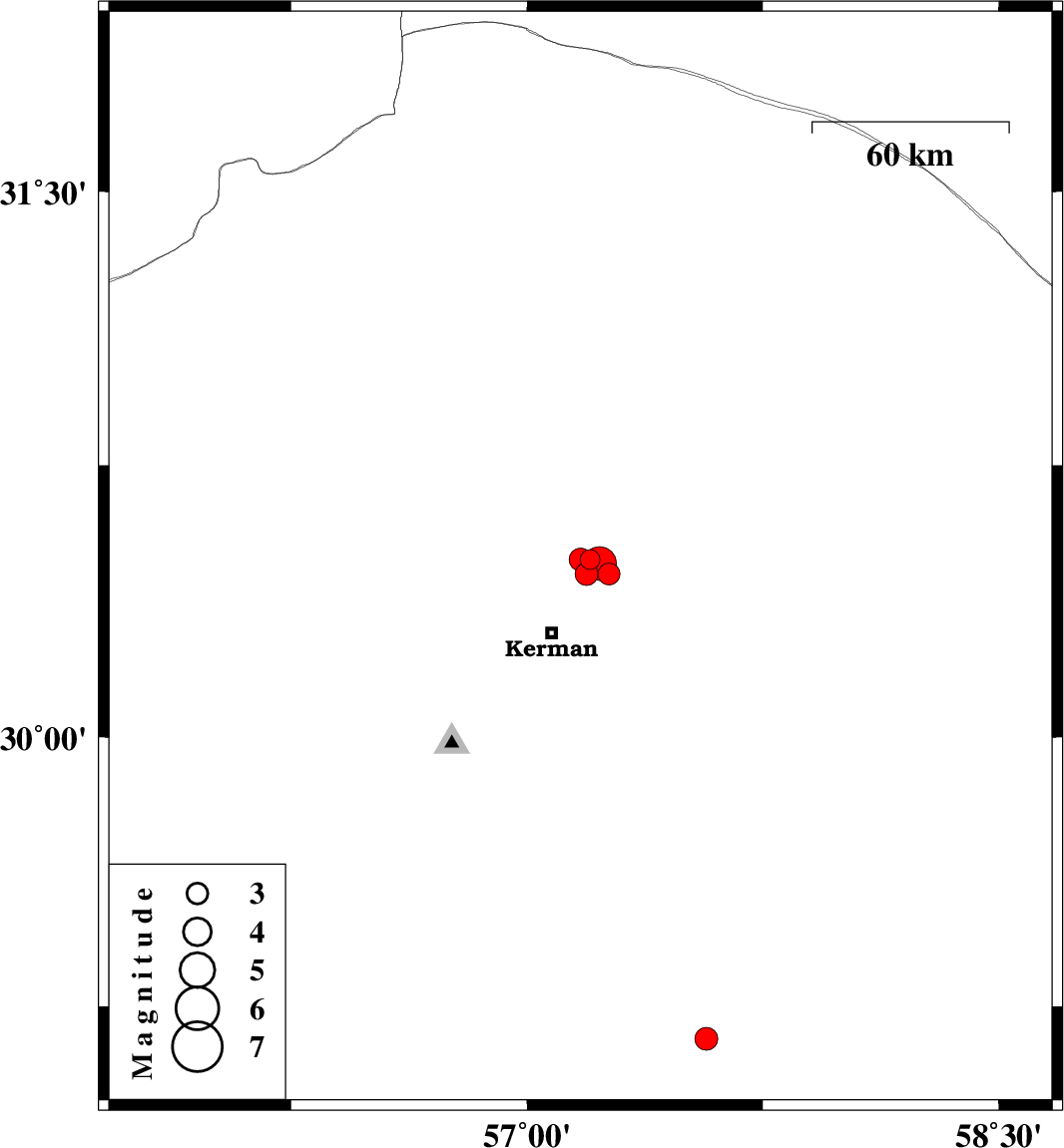 | 2012/12/03 | 13:44:27.8 | 17:14:27.8 | 30.45 | 57.19 | 14 | ML:3.3 | Kerman Province, 21 km North-East of Kerman | ||