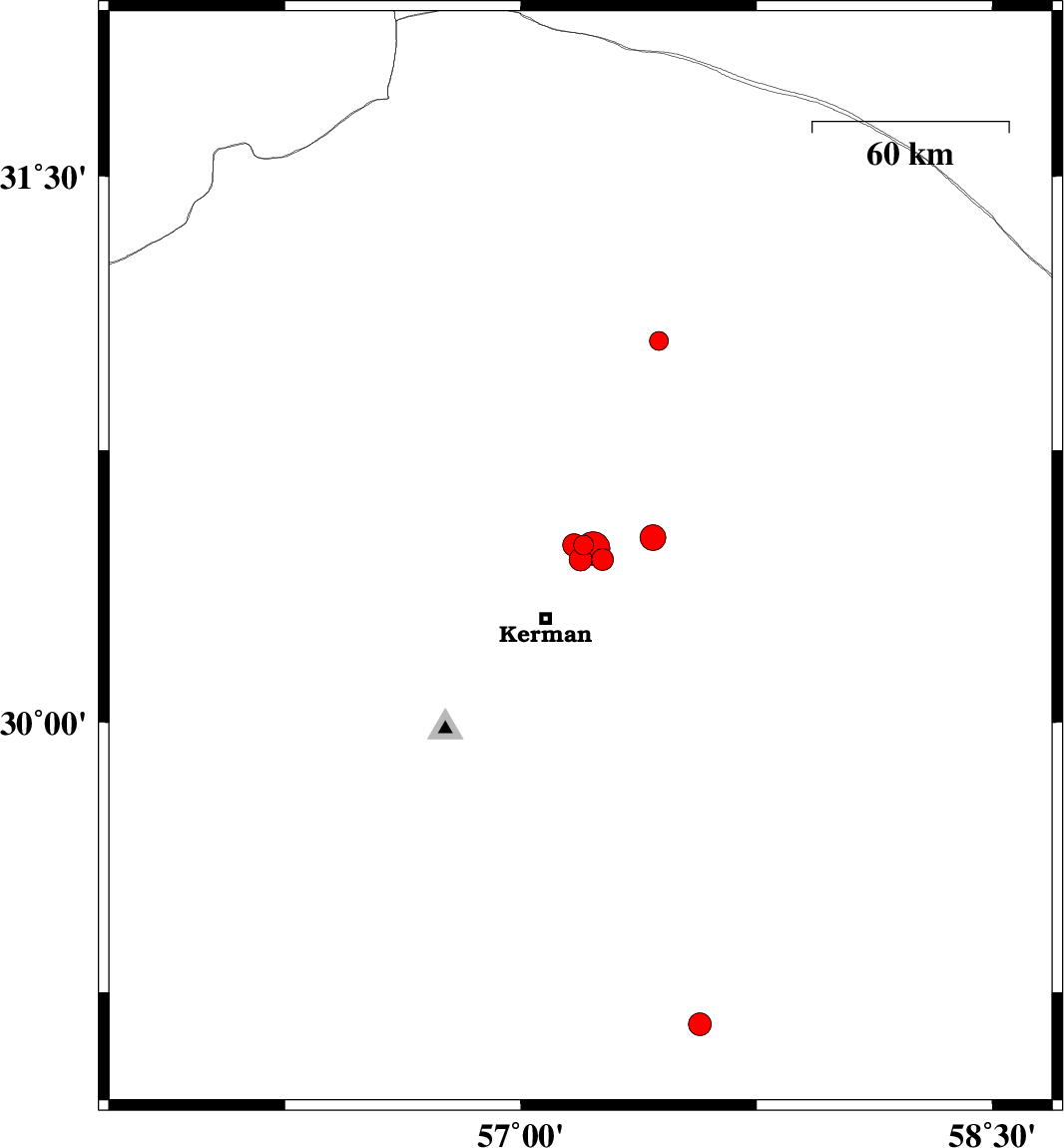 | 2012/12/03 | 13:44:27.8 | 17:14:27.8 | 30.45 | 57.19 | 14 | ML:3.3 | Kerman Province, 21 km North-East of Kerman | ||