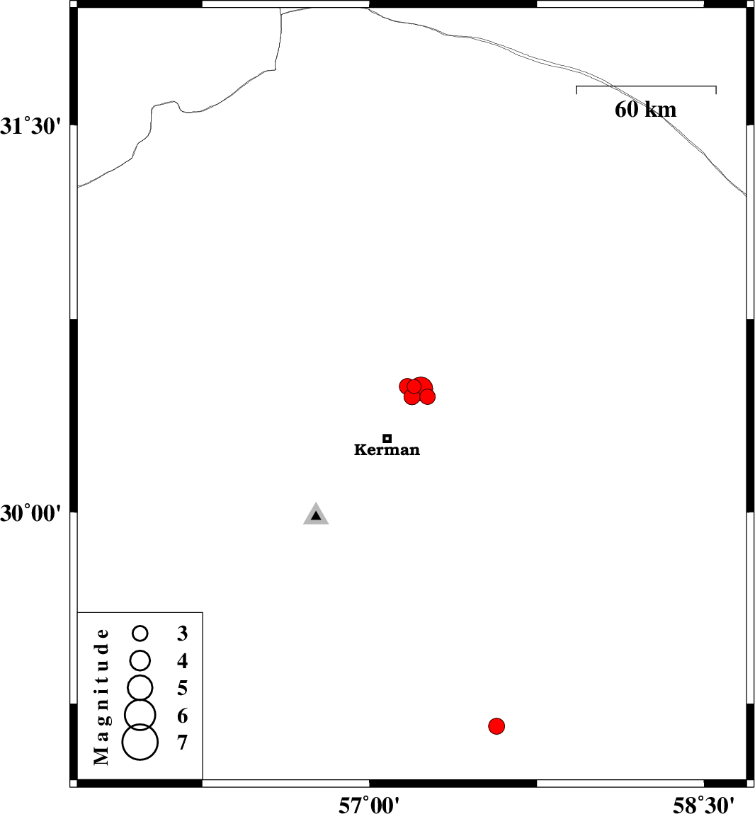| 2012/12/03 | 13:44:27.8 | 17:14:27.8 | 30.45 | 57.19 | 14 | ML:3.3 | Kerman Province, 21 km North-East of Kerman | ||