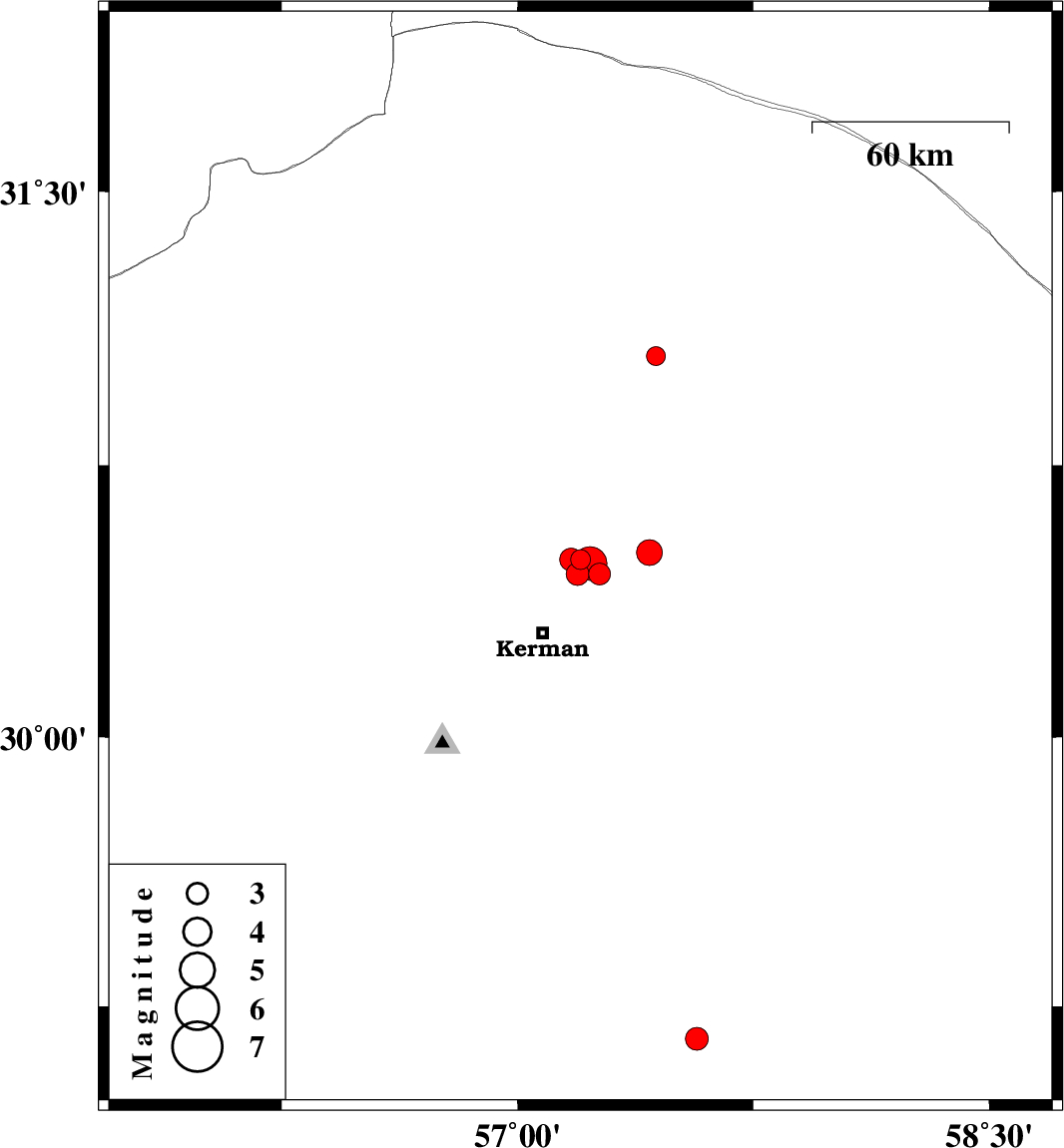| 2012/12/03 | 13:44:27.8 | 17:14:27.8 | 30.45 | 57.19 | 14 | ML:3.3 | Kerman Province, 21 km North-East of Kerman | ||