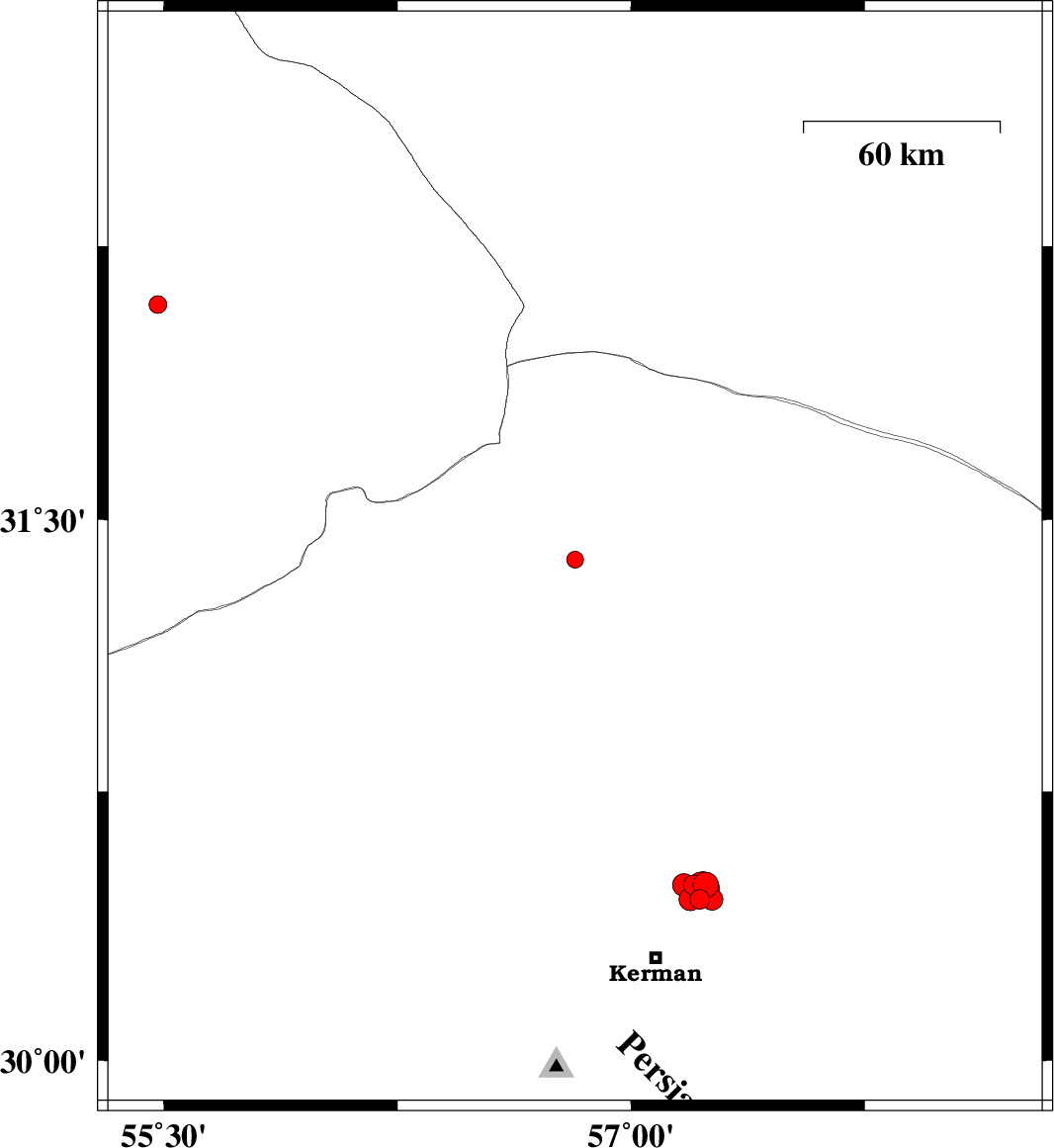| 2012/12/05 | 07:43:12.9 | 11:13:12.9 | 31.39 | 56.82 | 14 | ML:2.4 | Kerman Province, 14 km North of Ravar | ||