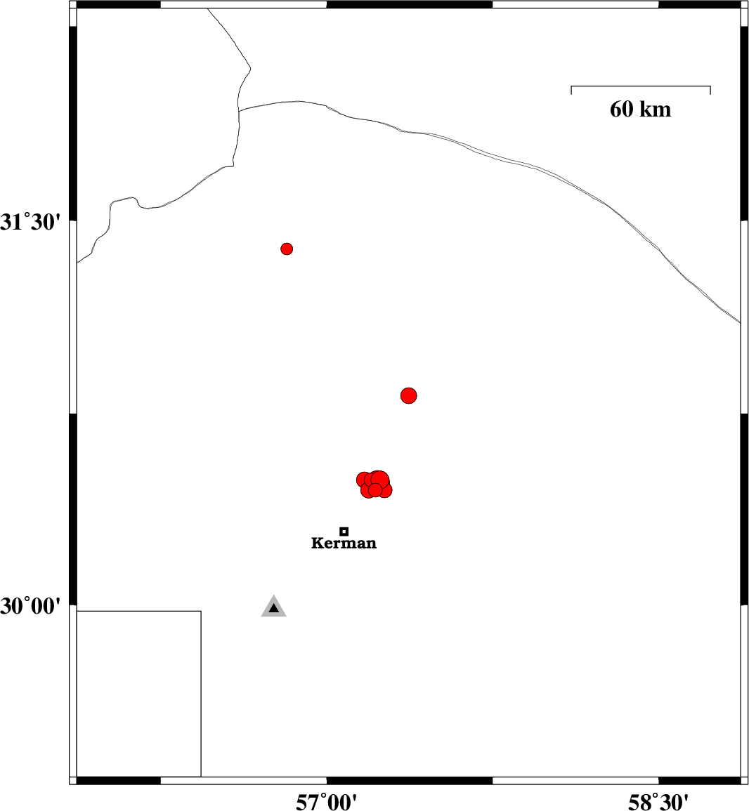 | 2012/12/05 | 07:43:12.9 | 11:13:12.9 | 31.39 | 56.82 | 14 | ML:2.4 | Kerman Province, 14 km North of Ravar | ||