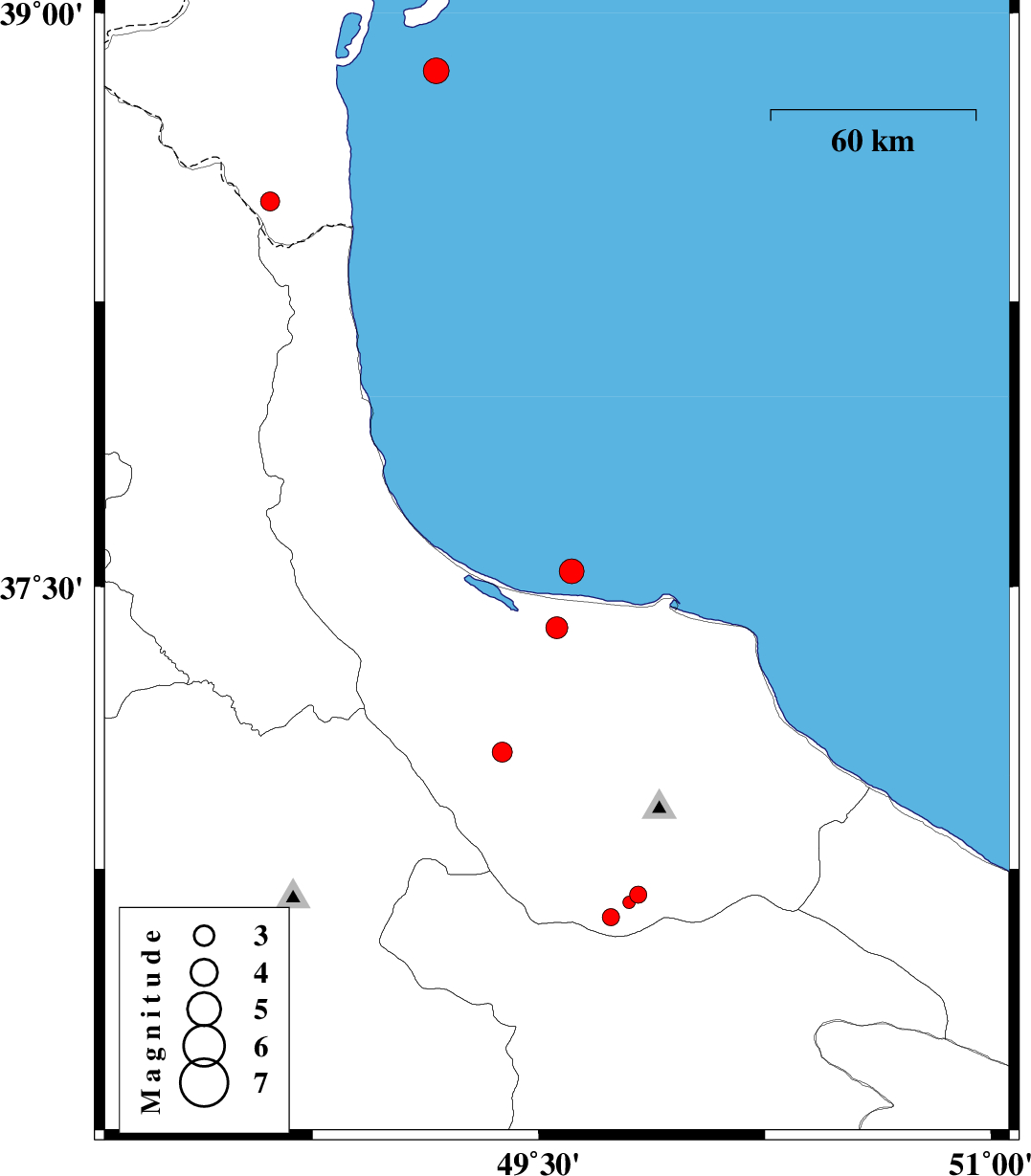 | 2012/11/26 | 21:13:43.0 | 00:43:43.0 | 38.86 | 49.11 | 27 | ML:3.8 | Caspian Sea, 54 km North-East of Astara | ||