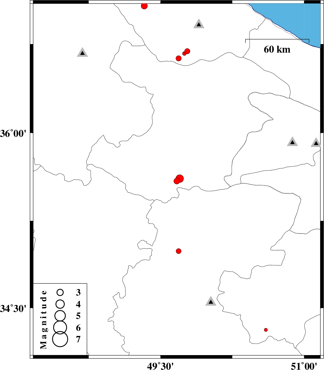 | 2012/11/27 | 13:22:58.3 | 16:52:58.3 | 34.99 | 49.69 | 17 | ML:2.4 | Markazi Province, 45 km North-West of Tafresh | ||