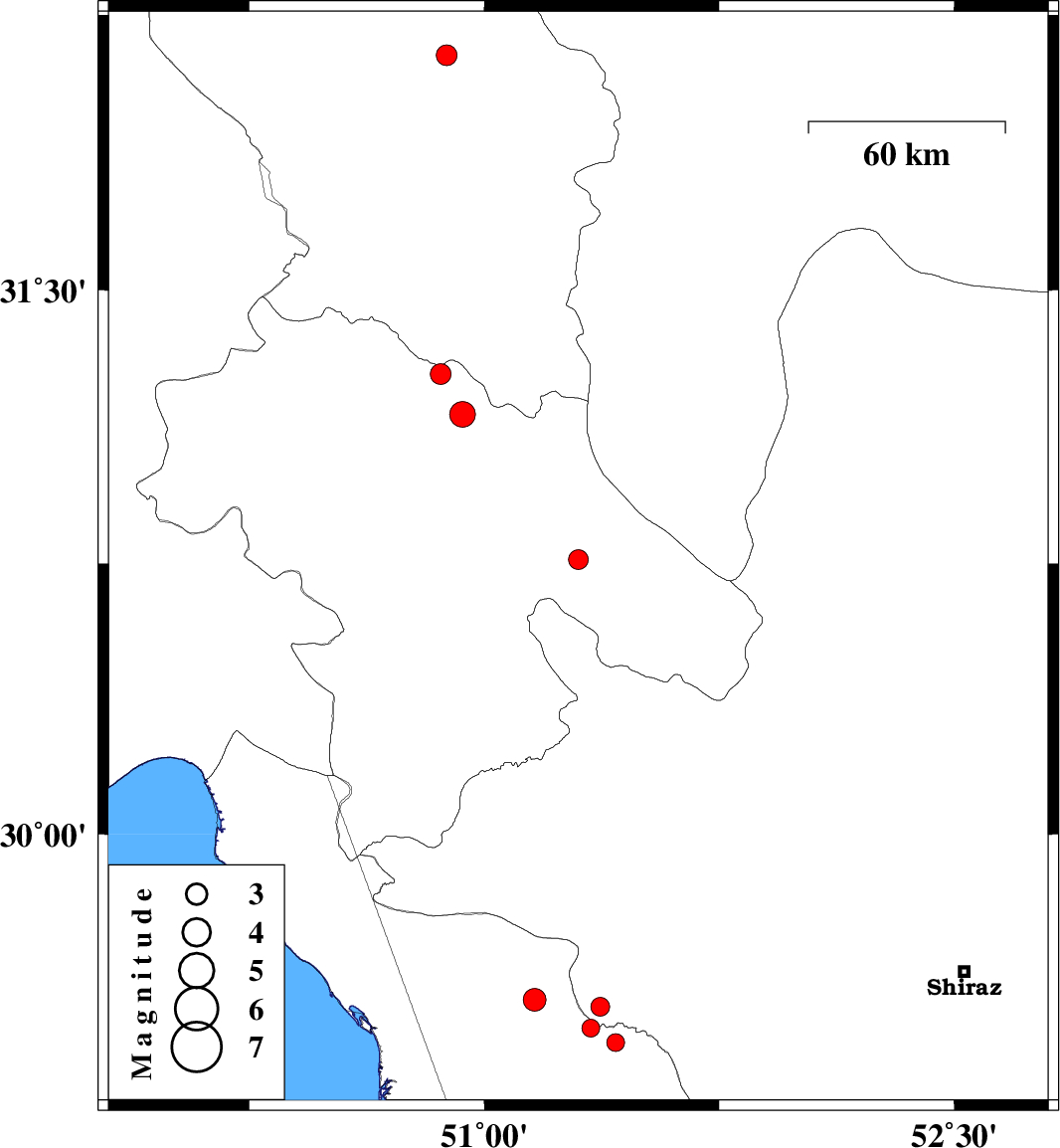 | 2012/11/25 | 05:48:27.7 | 09:18:27.7 | 29.54 | 51.16 | 14 | ML:3.2 | Bushehr Province, 31 km North of Borazjan | ||