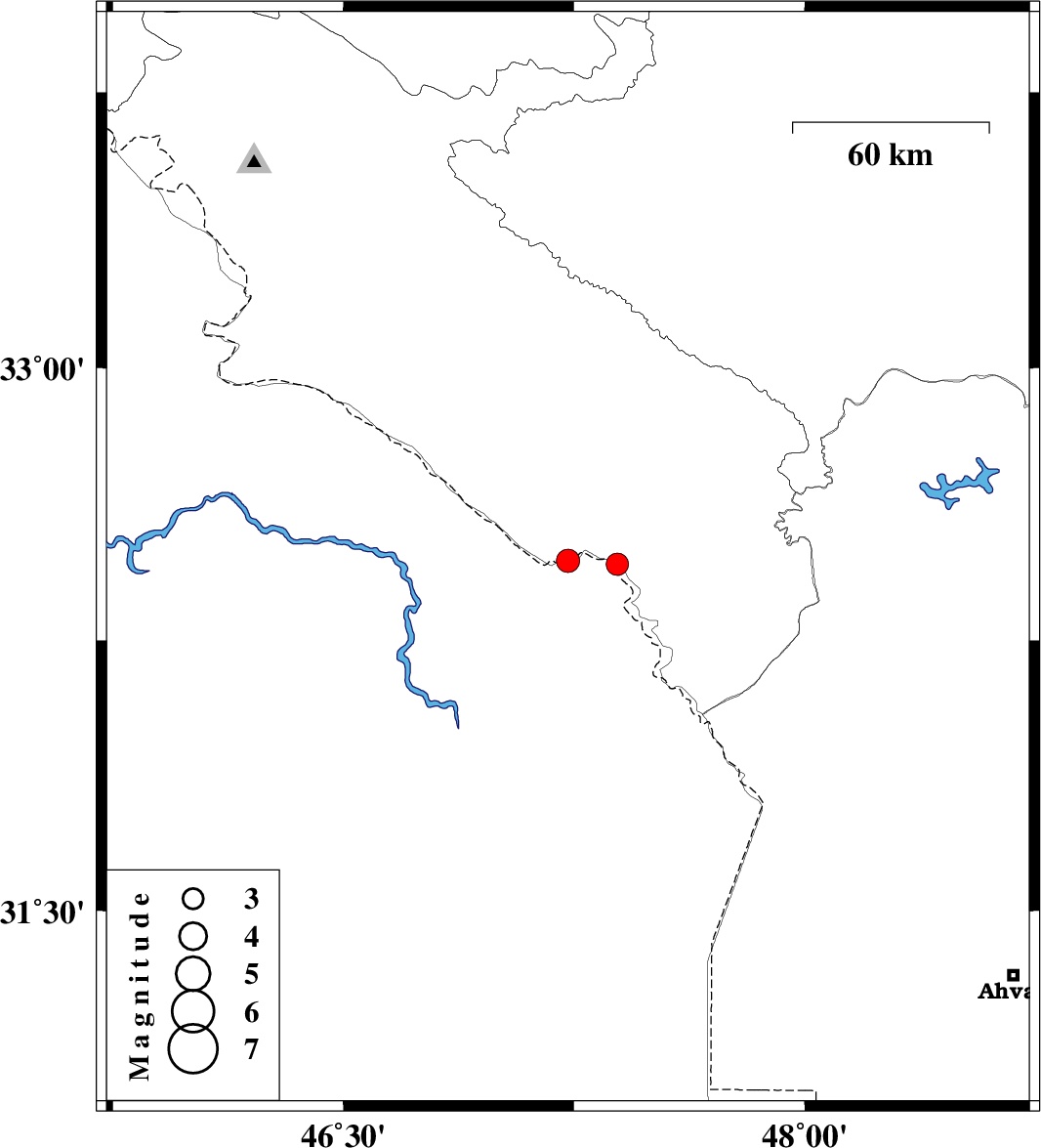 | 2012/12/12 | 02:13:30.5 | 05:43:30.5 | 32.46 | 47.39 | 36 | ML:3.2 | 28 km South-East of Dehloran |
