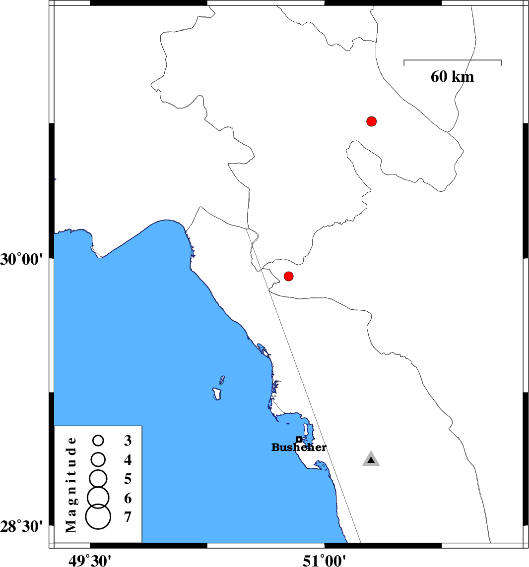 | 2012/12/12 | 22:00:51.9 | 01:30:51.9 | 29.9 | 50.77 | 14 | ML:2.7 | Fars Province, 50 km South of Dogonbadan | ||