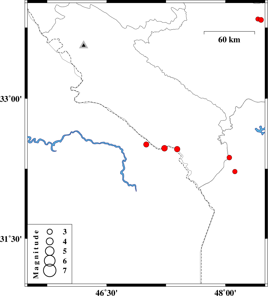 | 2012/11/19 | 15:41:47.6 | 19:11:47.6 | 32.37 | 48.05 | 18 | ML:2.8 | Khoozestan Province, 33 km West of Dezful | ||