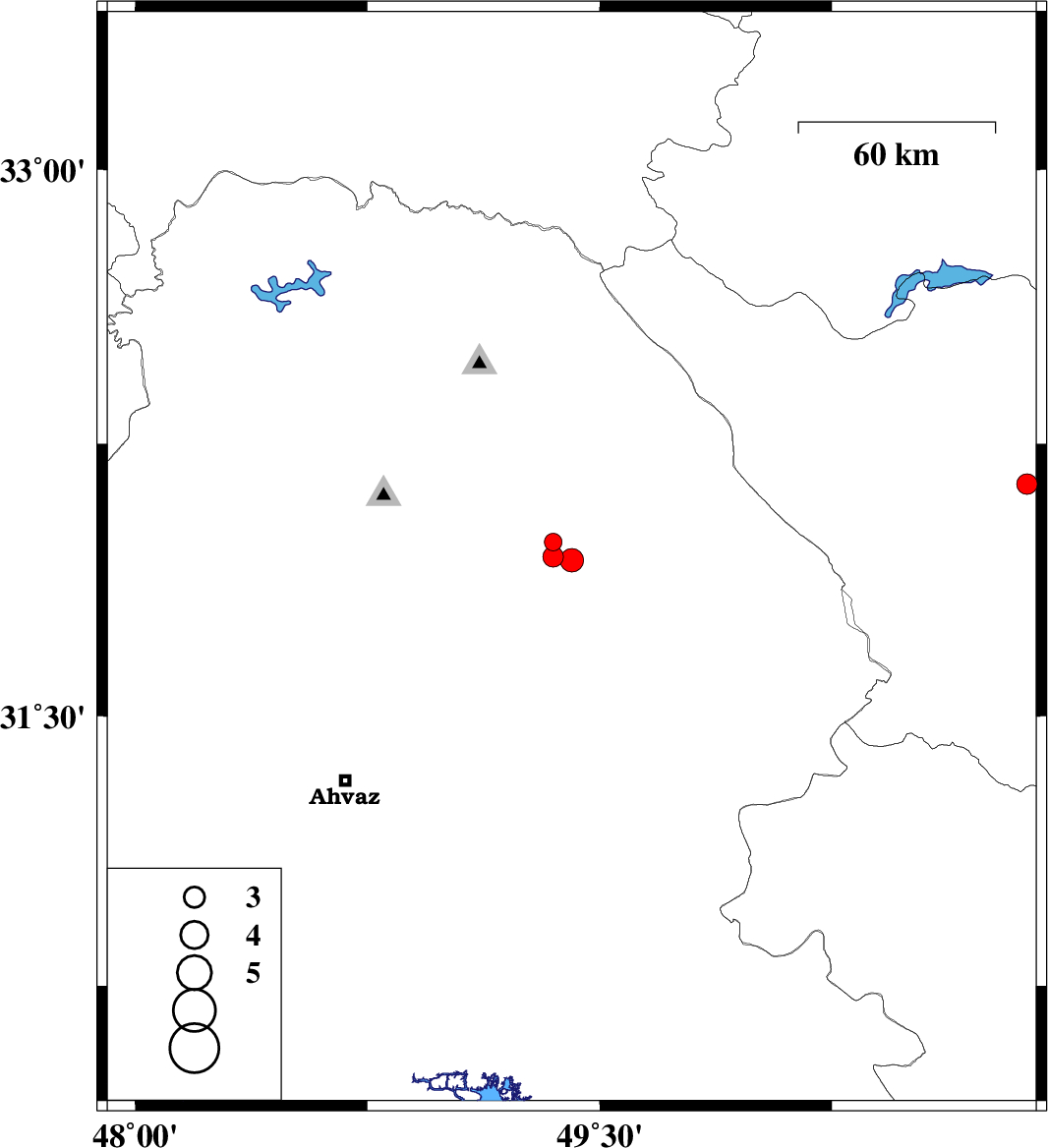| 2012/12/15 | 11:34:32.9 | 15:04:32.9 | 31.93 | 49.41 | 14 | ML:3.4 | Khoozestan Province, 10 km East of Masjed Soleyman | ||