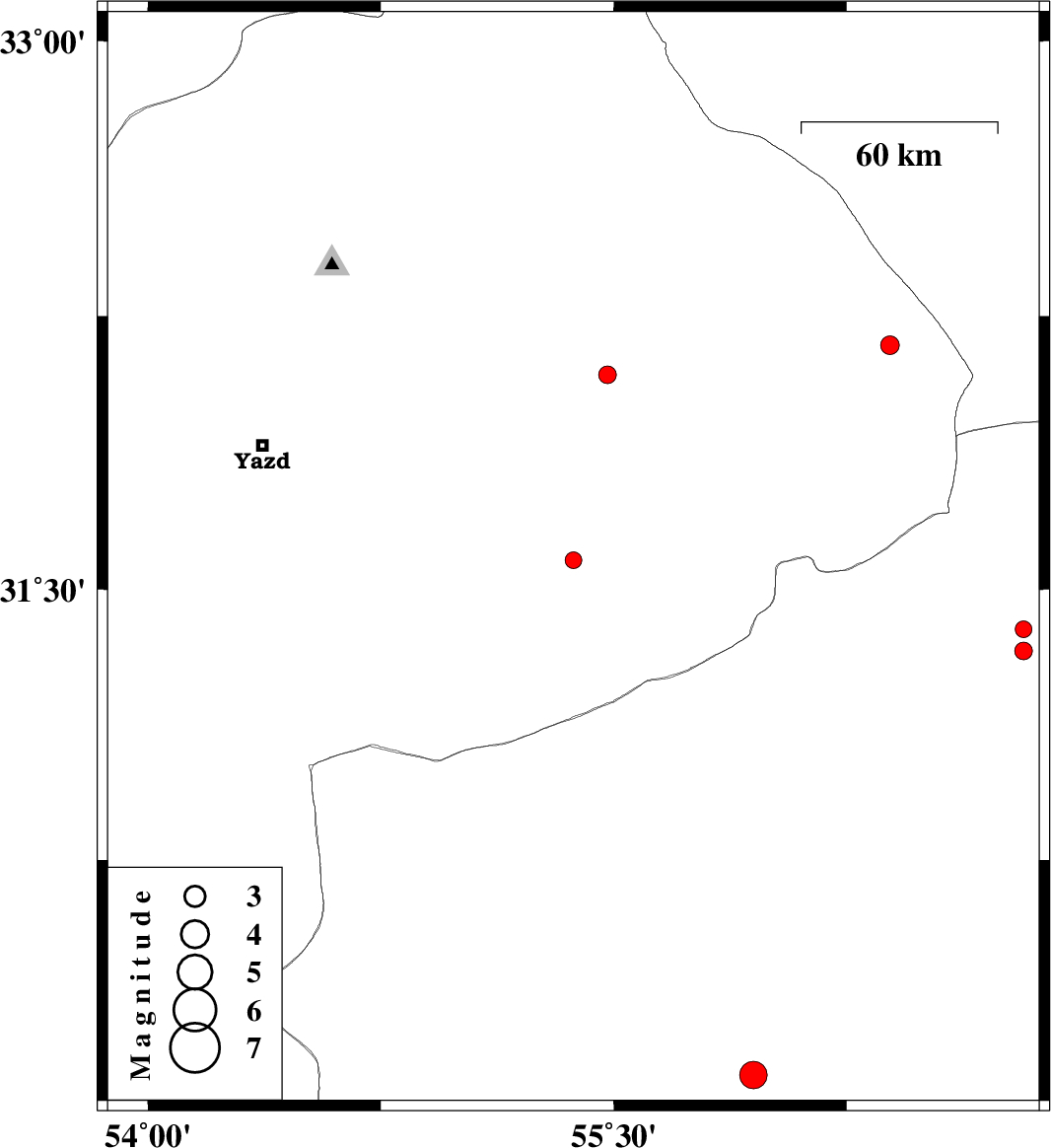| 2012/11/29 | 13:26:36.2 | 16:56:36.2 | 32.09 | 55.48 | 14 | ML:2.5 | Yazd Province, 55 km North of Bafq |