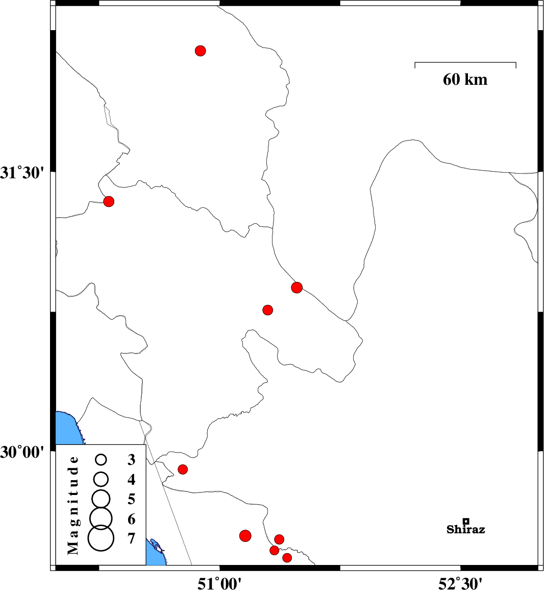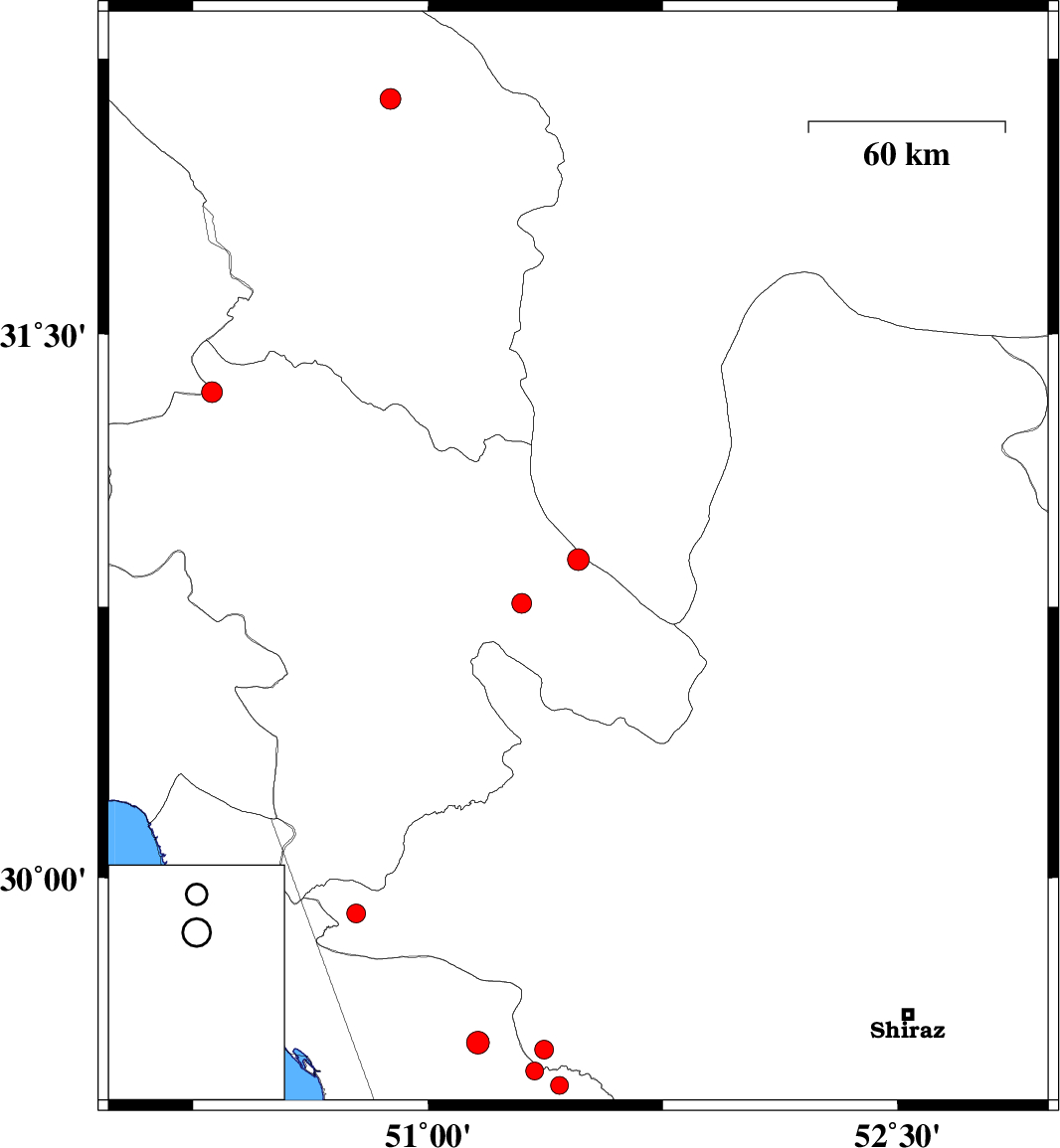 | 2012/11/25 | 05:48:27.7 | 09:18:27.7 | 29.54 | 51.16 | 14 | ML:3.2 | Bushehr Province, 31 km North of Borazjan | ||