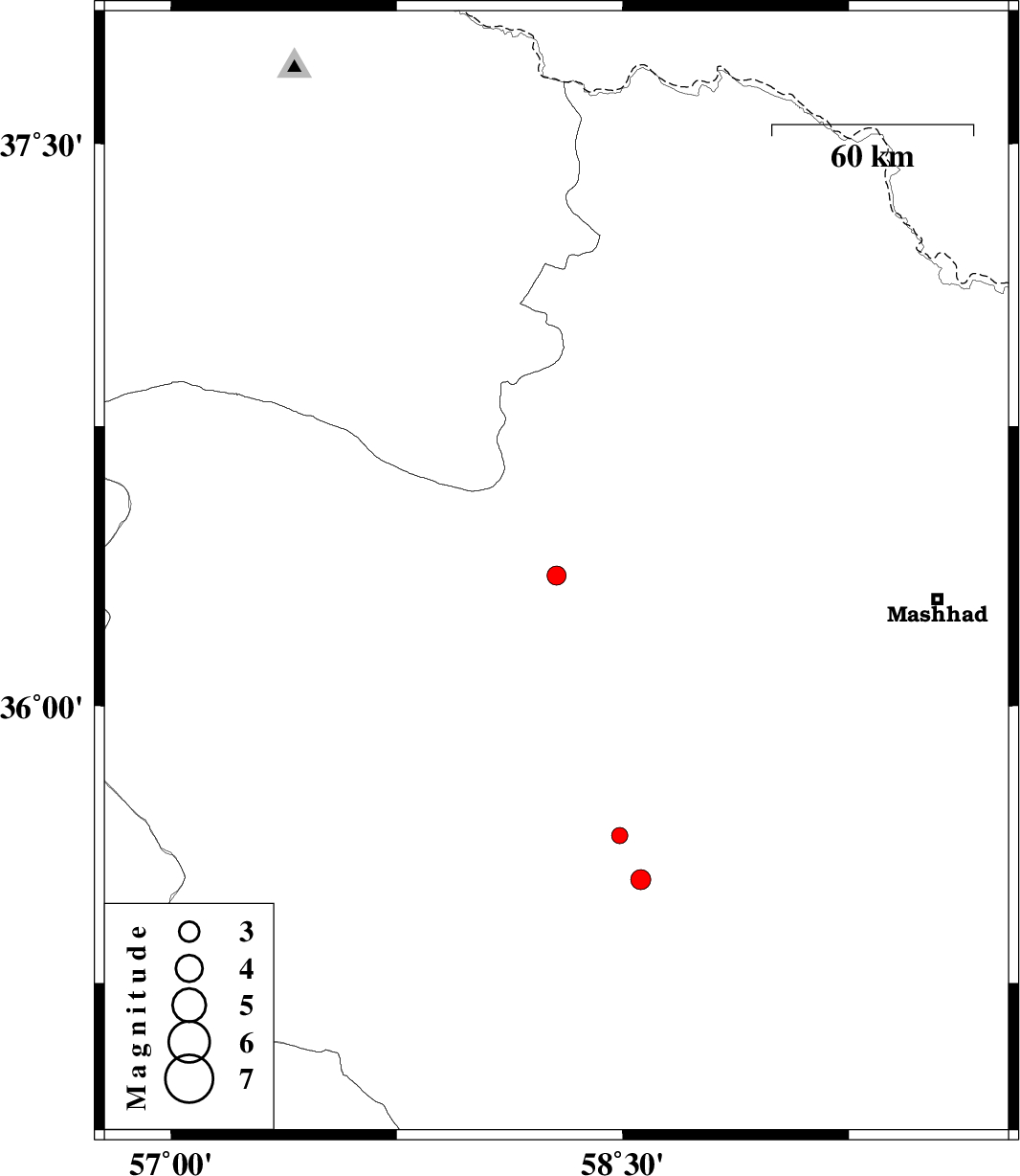 | 2012/12/21 | 22:58:46.2 | 02:28:46.2 | 36.35 | 58.28 | 15 | ML:2.8 | Khorasan(center) Province, 49 km North-West of Neyshabur | ||