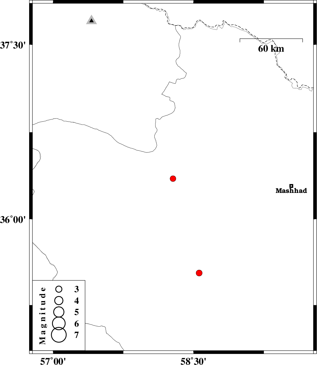 | 2012/12/21 | 22:58:46.2 | 02:28:46.2 | 36.35 | 58.28 | 15 | ML:2.8 | Khorasan(center) Province, 49 km North-West of Neyshabur | ||