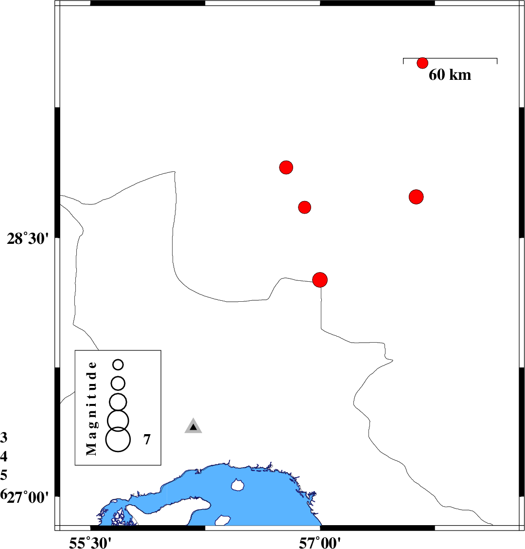 | 2012/12/09 | 00:14:06.4 | 03:44:06.4 | 27.91 | 56.9 | 14 | ML:4.4 | Hormozgan Province, 63 km North-West of Dehbarez | ||