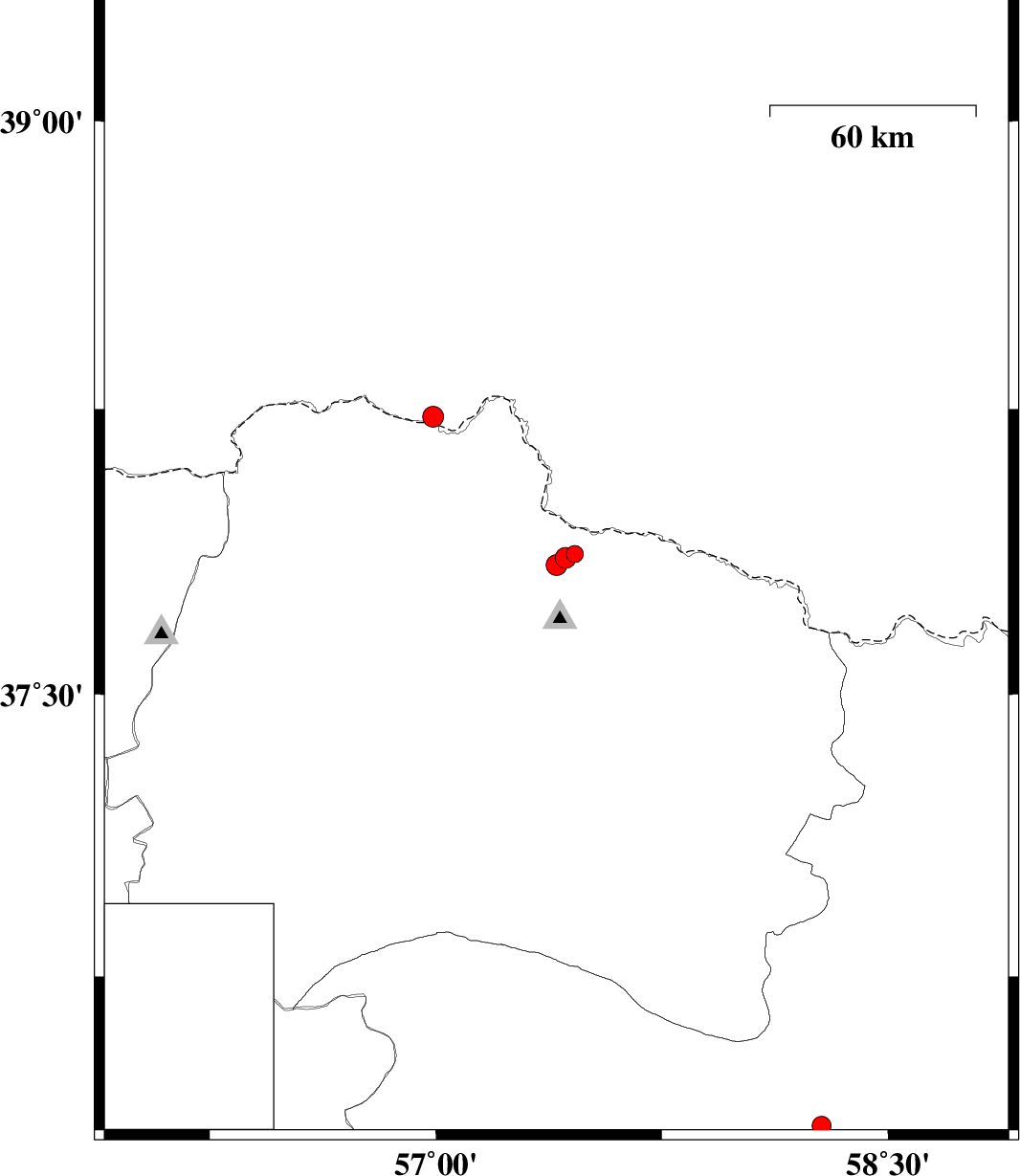 | 2012/12/23 | 21:24:16.1 | 00:54:16.1 | 37.87 | 57.46 | 6 | ML:2.6 | Khorasan(north) Province, 45 km North-East of Bojnurd | ||